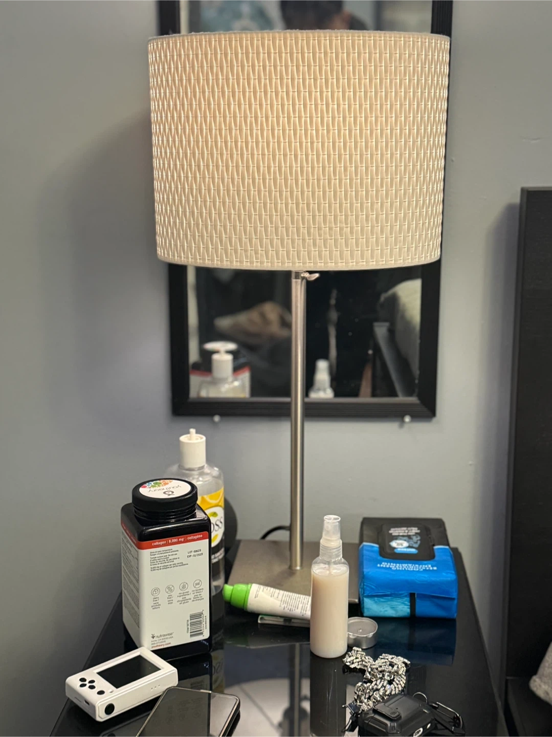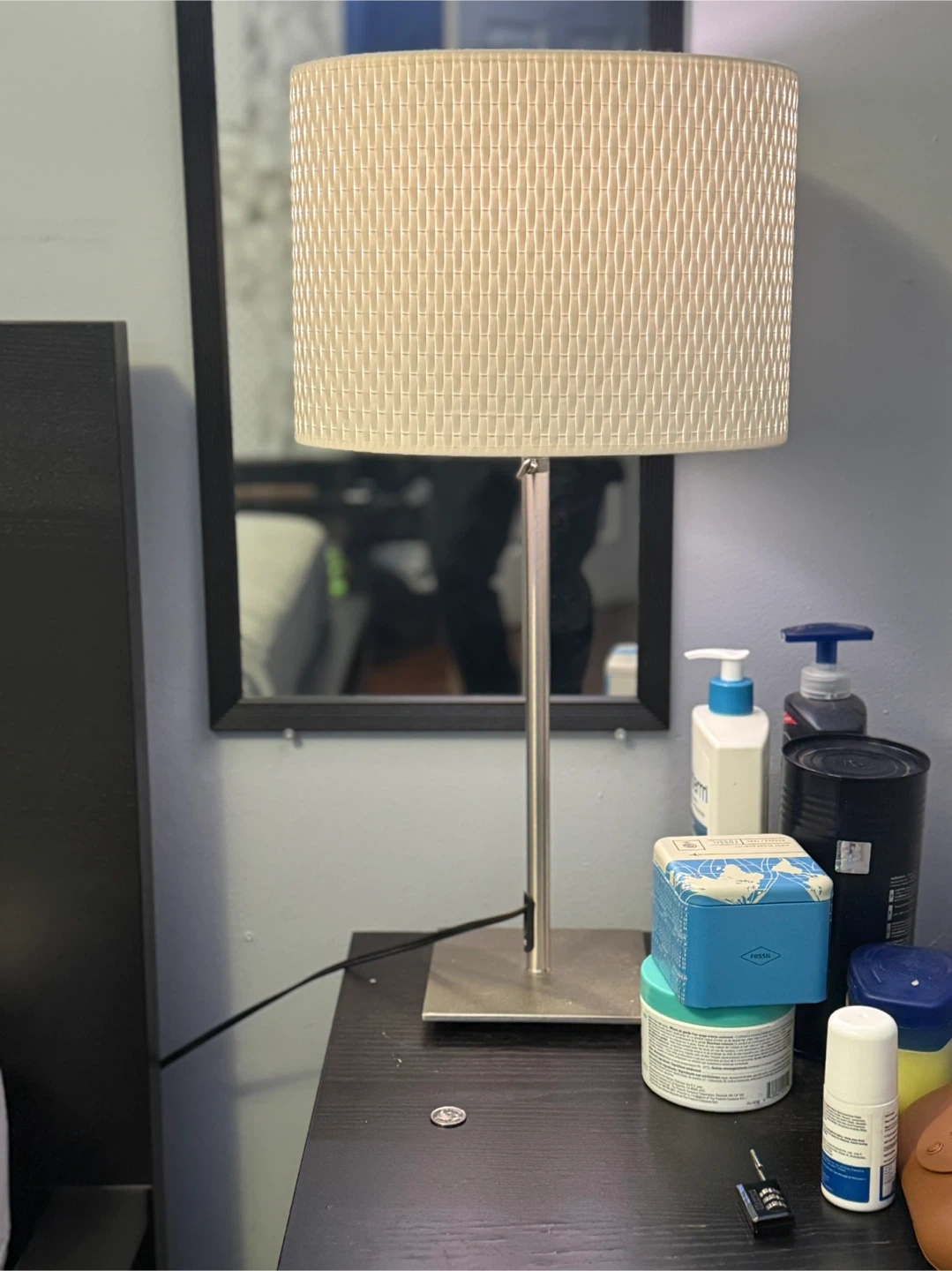 This table lamp features a woven beige shade and a brushed metal base. It's a nice size for a nightstand or side table. Provides ambient lighting for any room.