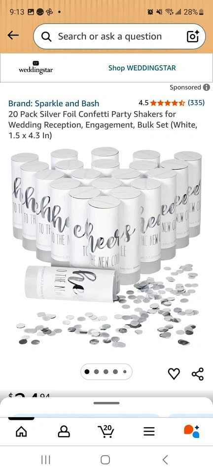 Sparkly confetti shakers for your special day. This is a 20 pack of silver foil shakers with white cylinders that say 'cheers to the new couple'. Great for wedding receptions or engagement parties. Brand is Sparkle and Bash. Each shaker is 1.5 x 4.3 inches. Still in the box. Regular Price: $24.99. Pick up in lobby near Yonge and Sheppard. Cash only.
