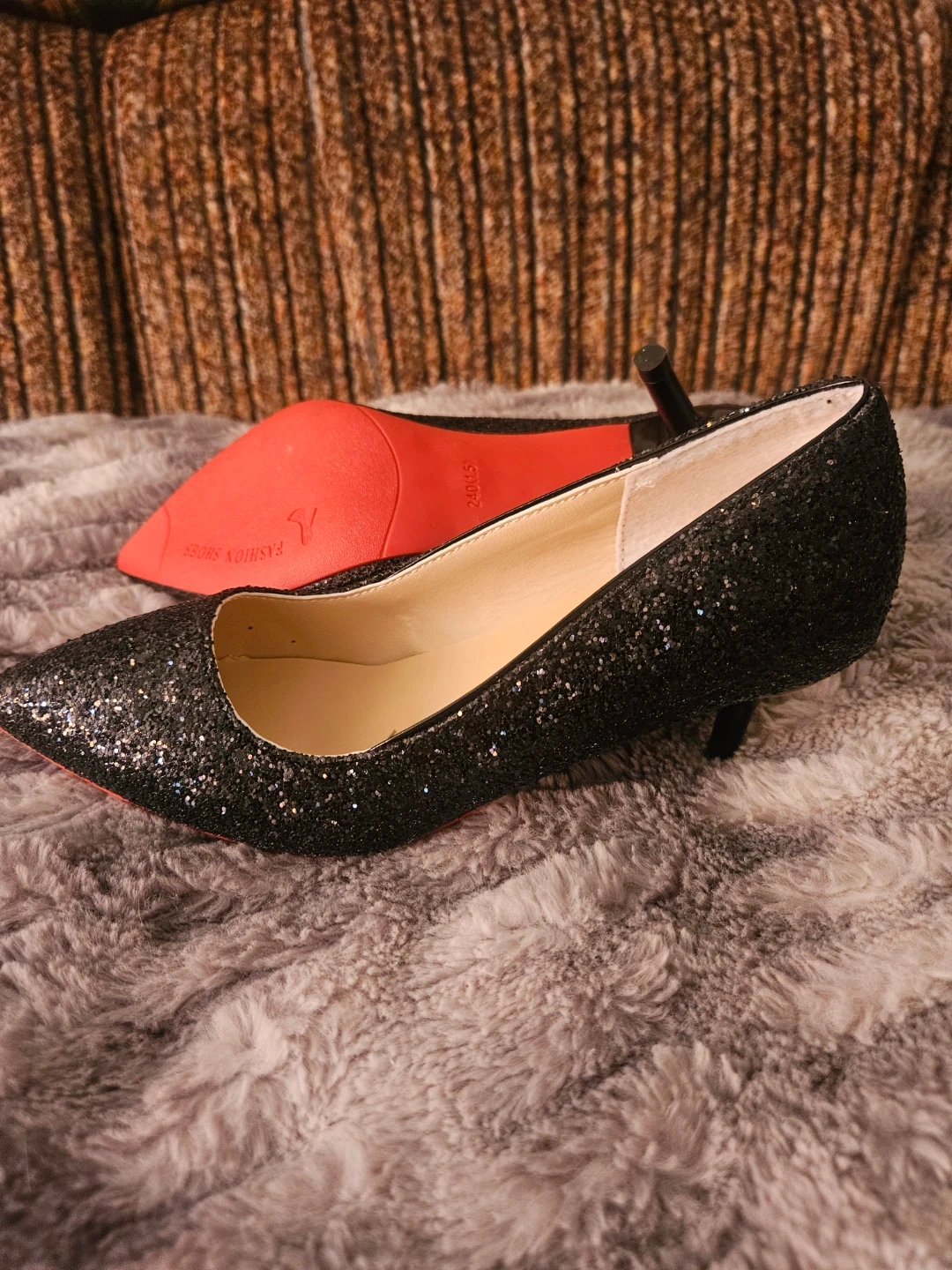Sparkly black pointed toe heels. These fashion shoes have a classic red sole. Heel height is approximately 2.5 inches. Perfect for a night out!