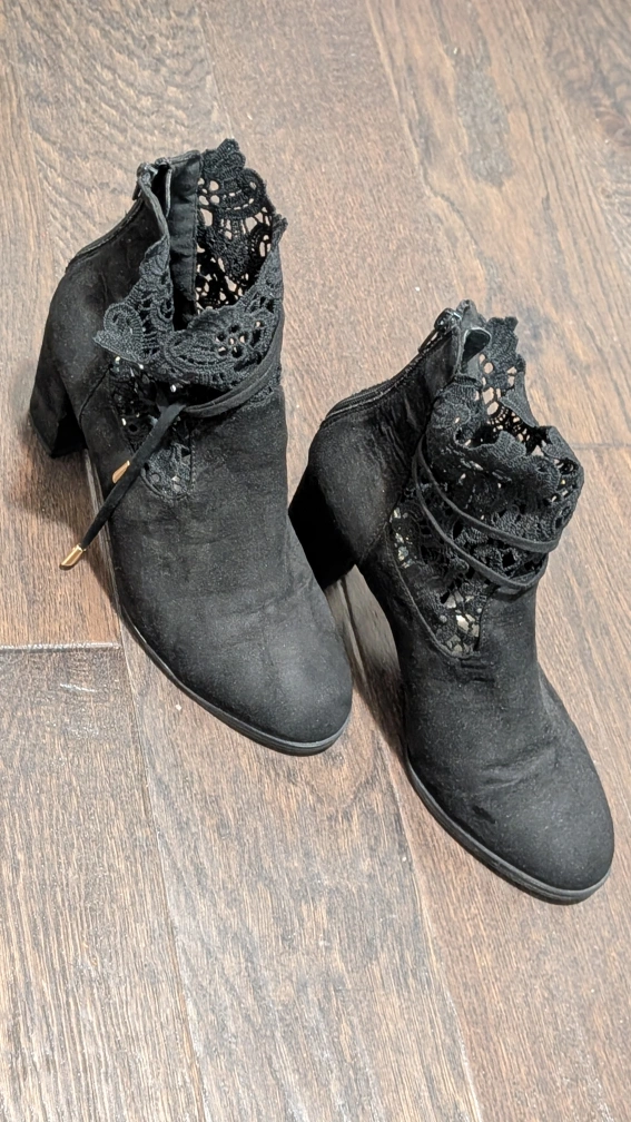 Cute black ankle boots featuring a unique lace detail around the top. They're a size 9 (40 EU) and have a comfortable heel height. Perfect for adding a touch of elegance to any outfit!