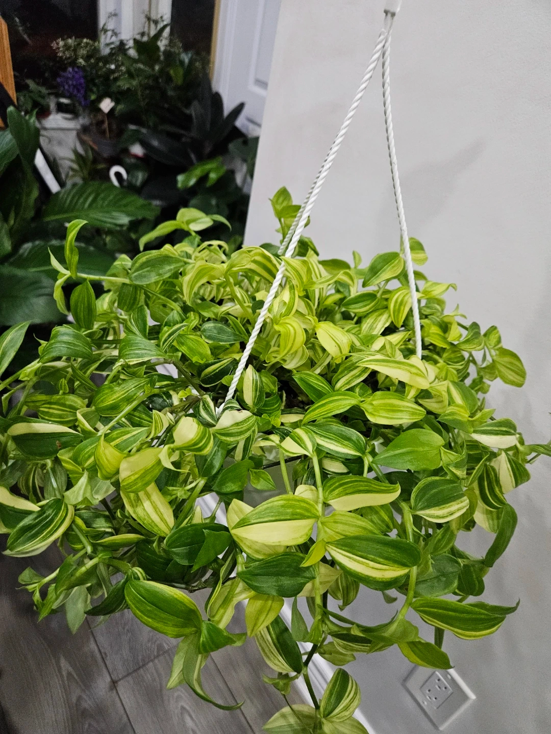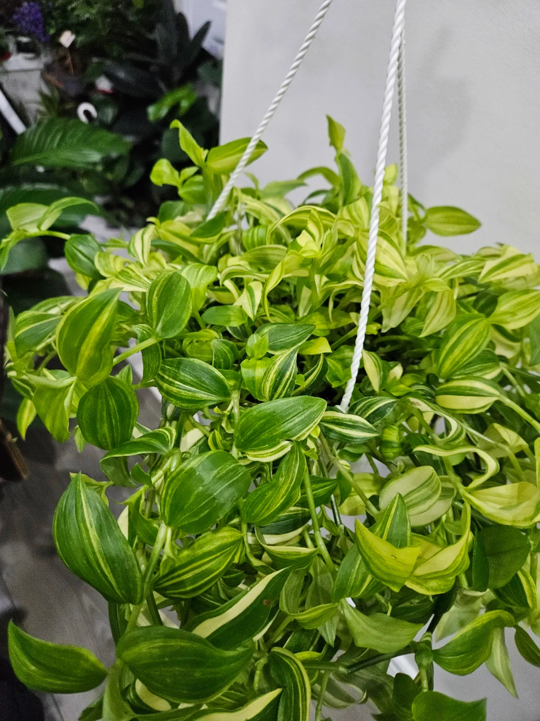 This is a lovely. Tradescantia variegated hanging plant. It's lush and green with beautiful yellow and white variegation on its leaves. It's a great choice for adding some life to any room!