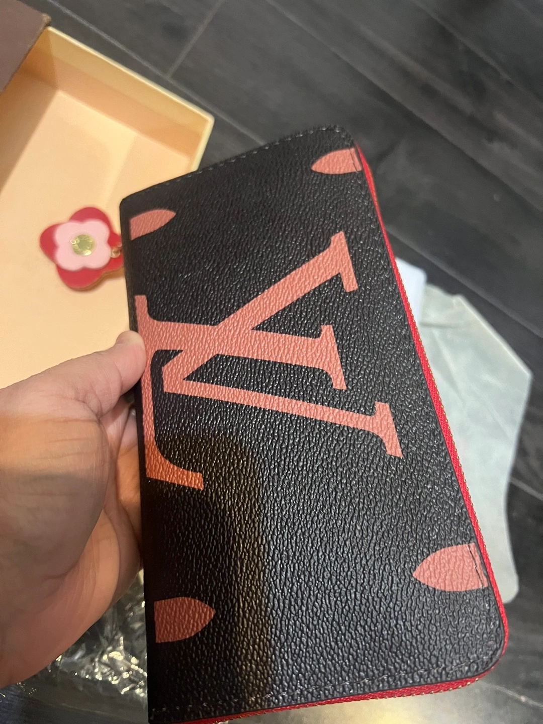A Louis Vuitton zip-around wallet. Features the classic monogram pattern with a red zipper and lining. Includes original box and dust bag. This wallet is great for keeping your essentials organized.
