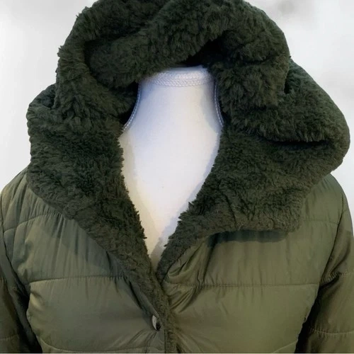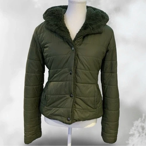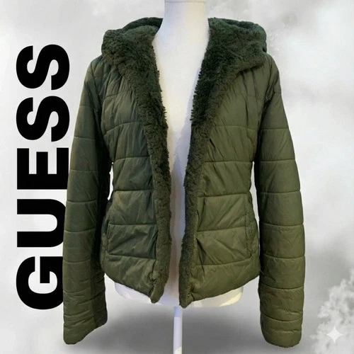 GUESS Size S. Olive Green / Army Green quilted puffer jacket with a Sherpa/Faux Fur-lined hood and trim. Features a lightweight yet warm design, full zip closure with button overlay, and two side hand pockets. It has a flattering, streamlined fit.