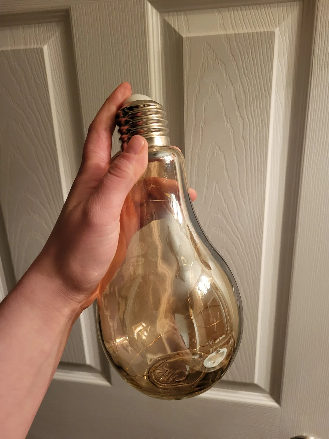 A unique decorative lamp shaped like a large light bulb, filled with warm fairy lights. It's made of clear glass with a metallic finish on the socket. This light adds a cozy ambiance to any room!