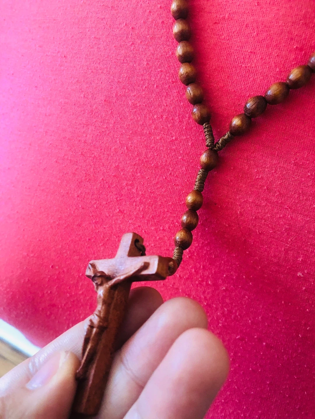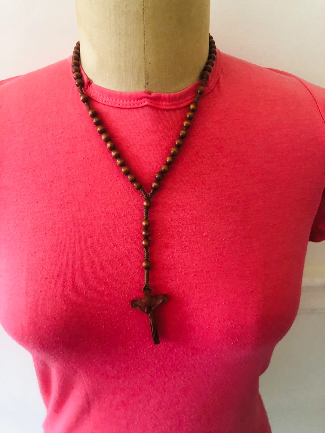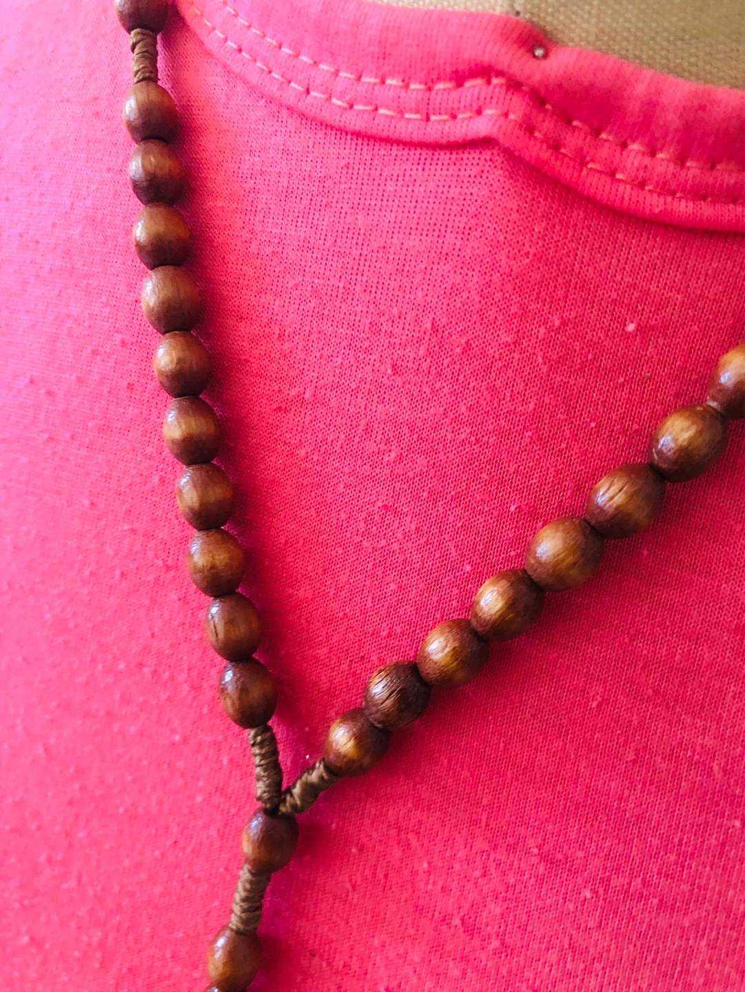 This is a simple rosary necklace featuring wooden beads and a carved crucifix. The beads are strung on a durable cord. It's suitable for personal prayer or as a spiritual accessory.