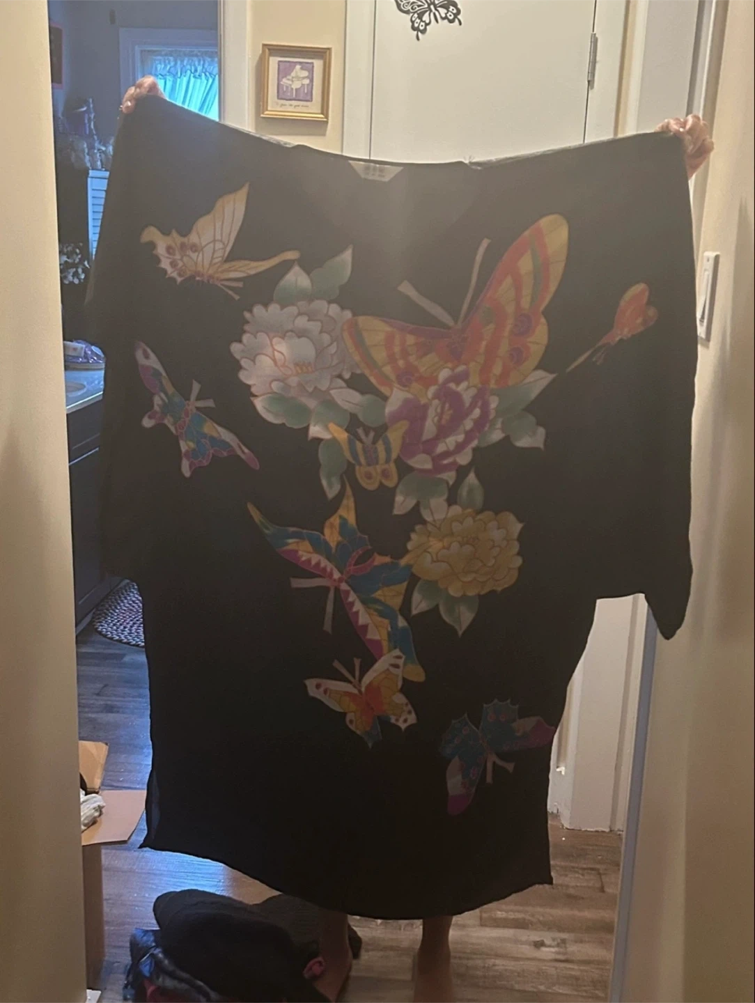 This black kimono features a vibrant print of butterflies and flowers. It's made of lightweight fabric, perfect for layering. The loose, flowy design makes it a versatile accessory.