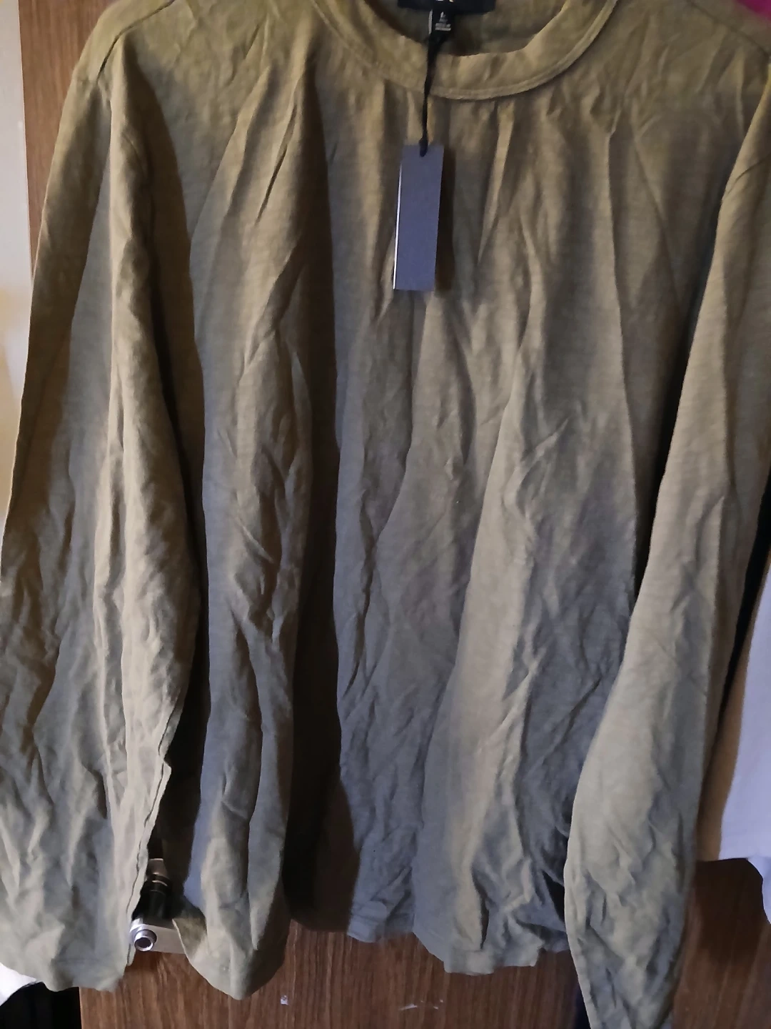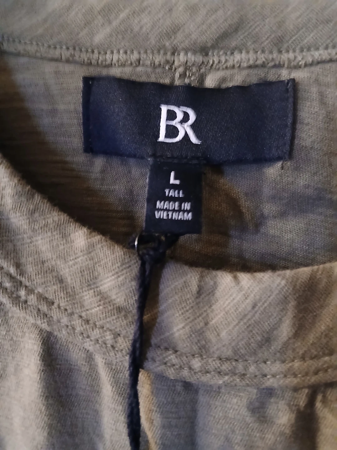 First, there's a long-sleeve olive green shirt from Banana Republic in size L Tall.
