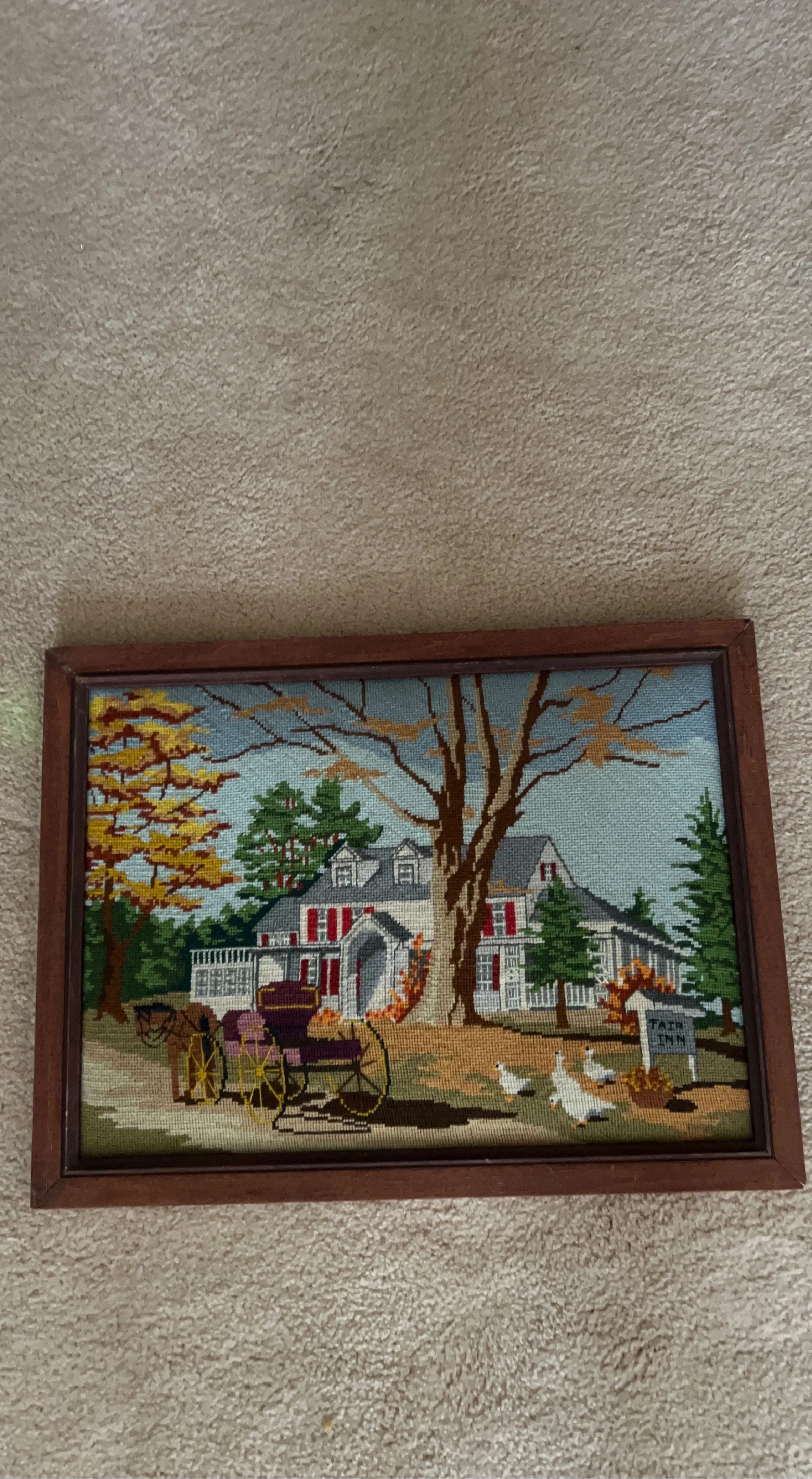 Charming framed needlepoint artwork depicting a scenic "Fair Inn" with a horse-drawn carriage and geese. It's a lovely piece for home decor. This artwork's dimensions are approximately 20" x 16".