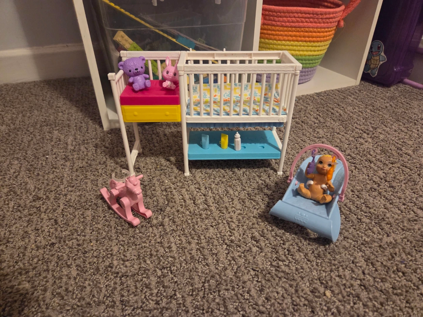 Barbie baby crib with a changing table and accessories. It includes a rocking horse, a baby doll in a bouncer, and a small toy bottle.