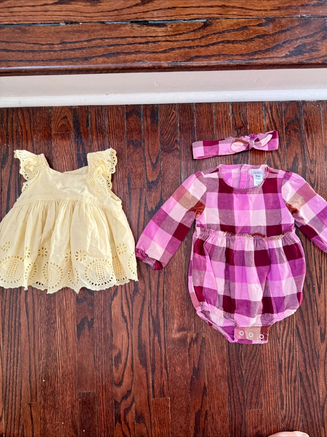 Light yellow dress from GAP, only worn twice, size 6-12mts. Carter's romper, worn a few times but in great condition, no fuzz, size 9M. Smoke-free home. Free hangers.