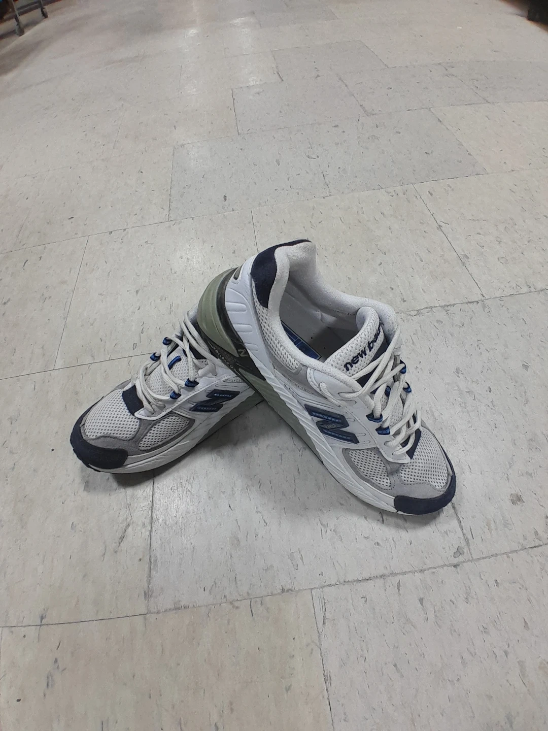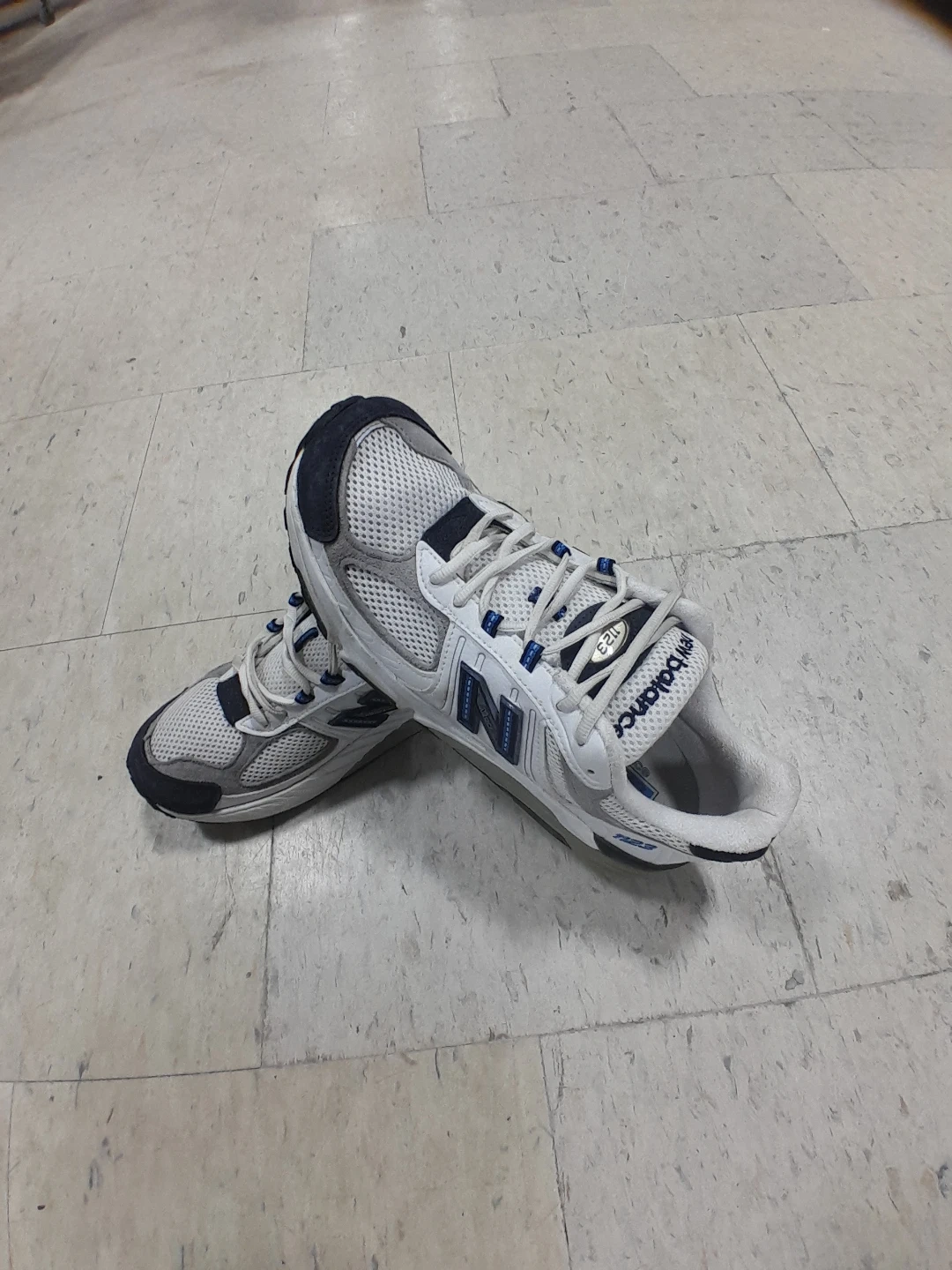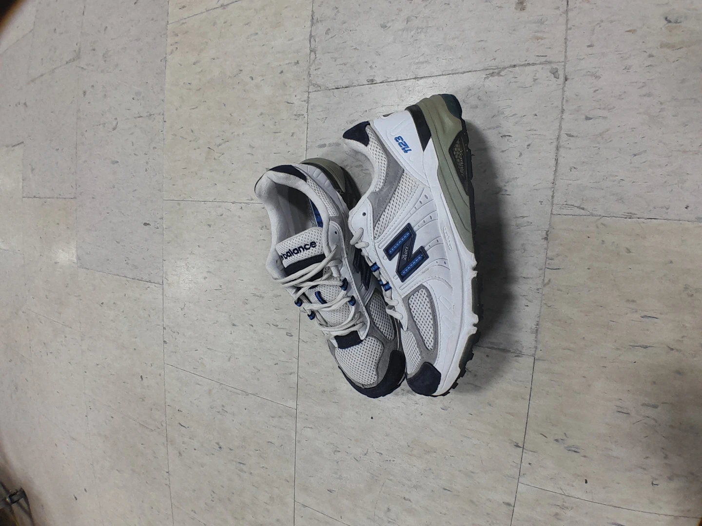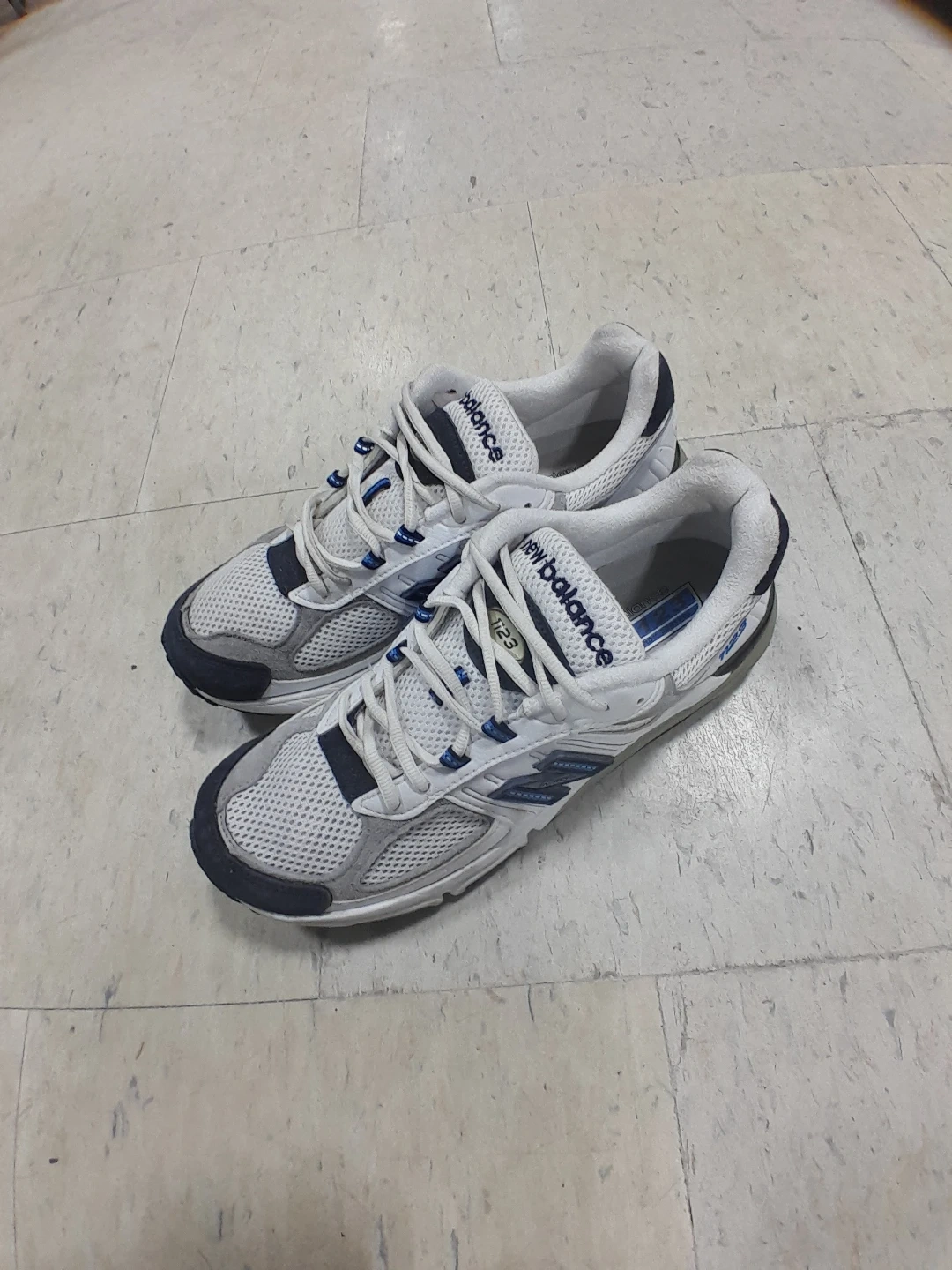 New Balance 823 running shoes in white and blue. These athletic sneakers are made with mesh and synthetic materials. They feature a lace-up closure for a secure fit. This footwear is great for casual wear or light training men's Size 9.5