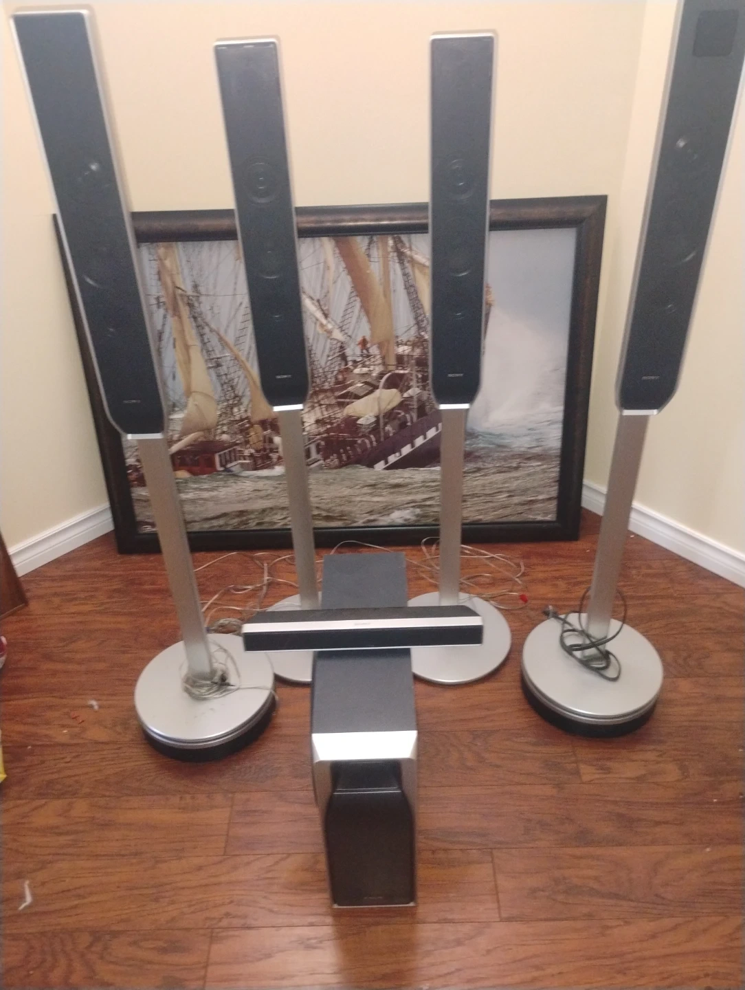 This is a Sony 5.1 channel surround sound speaker system. It includes four tower speakers, a center channel speaker, and a subwoofer. It's a great setup for enhancing your home entertainment experience.