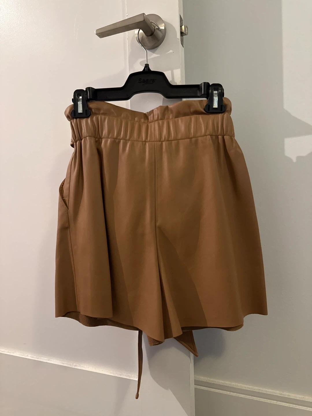 Selling a pair of tan-coloured paper bag style shorts! They are in great condition and would look great with a tucked in top. The material feels like leather. Perfect for a night out or a casual day.