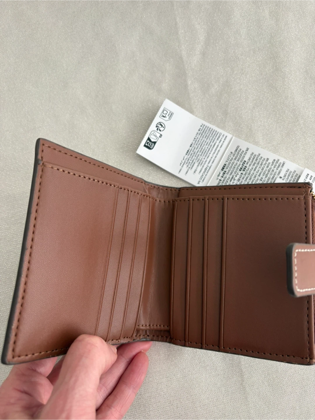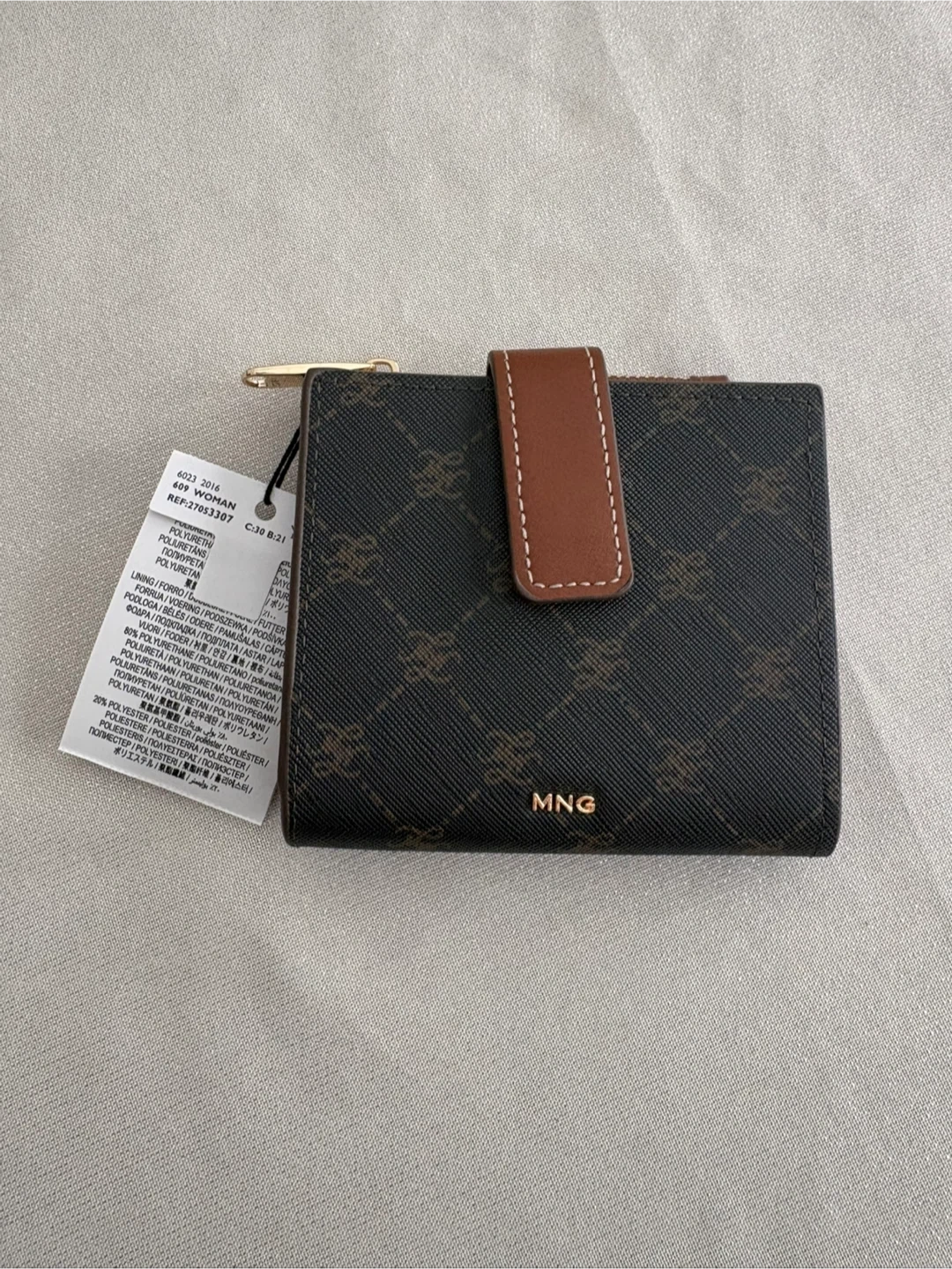 This MANGO bi-fold wallet features a brown monogram print with a faux leather snap closure. It has multiple card slots inside and a zippered coin pocket. 80% Polyurethane, 20% Polyester exterior.