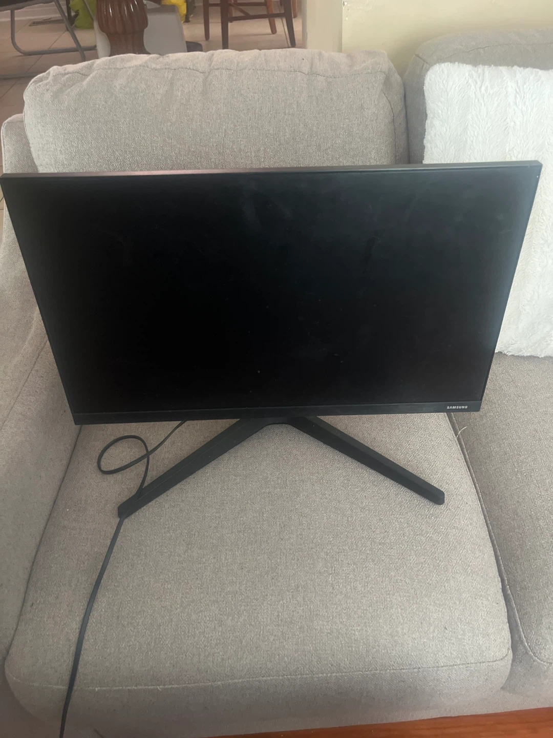 This is a Samsung computer monitor. It has a black stand and a black casing. It's a good size for a desk setup.