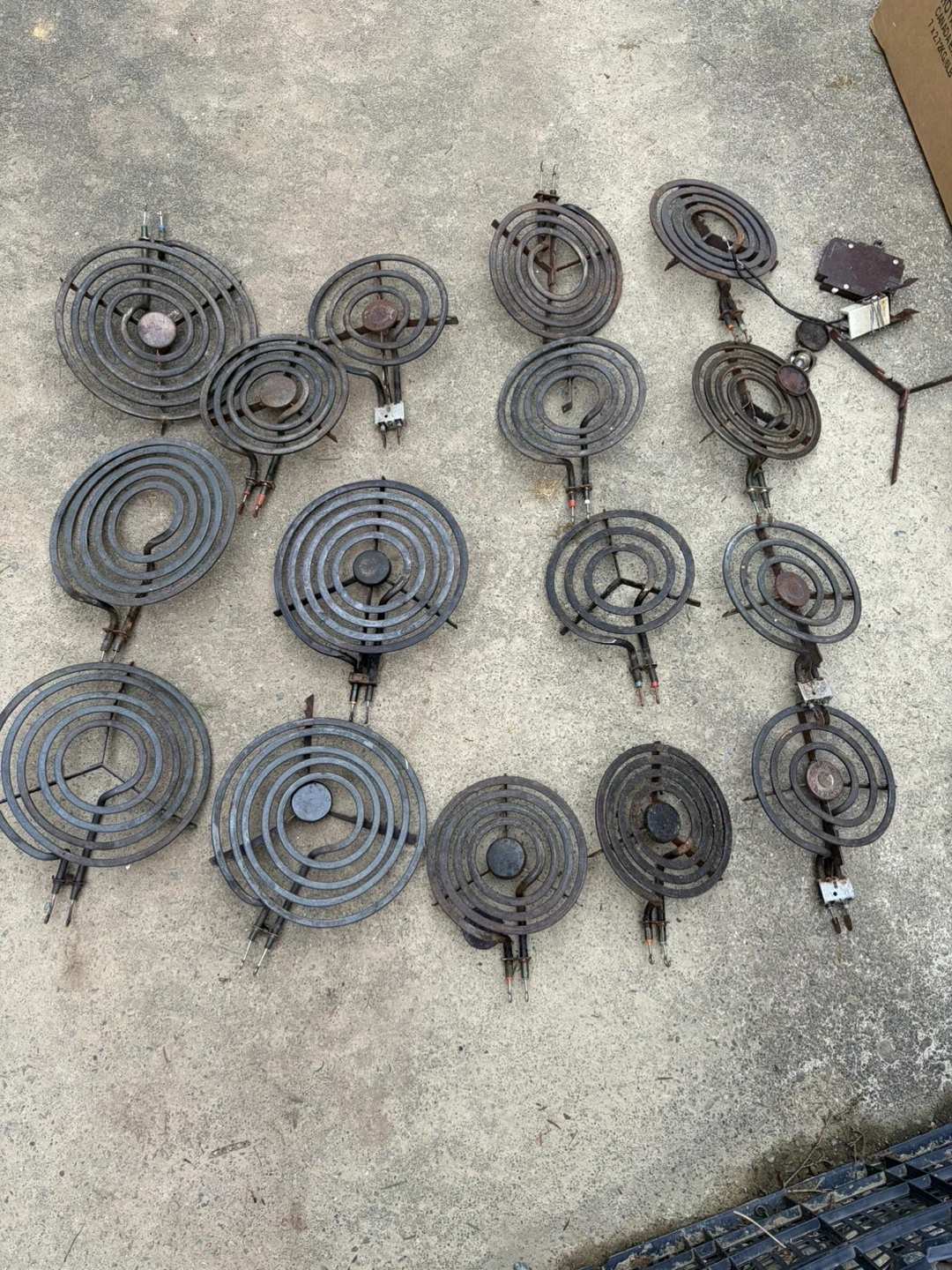Selling a lot of 14 electric stove top coil burners. They're in used condition with some rust. Various sizes included. These are standard replacement parts.