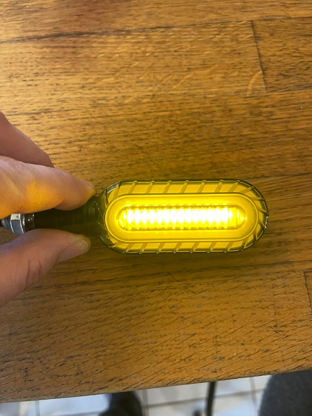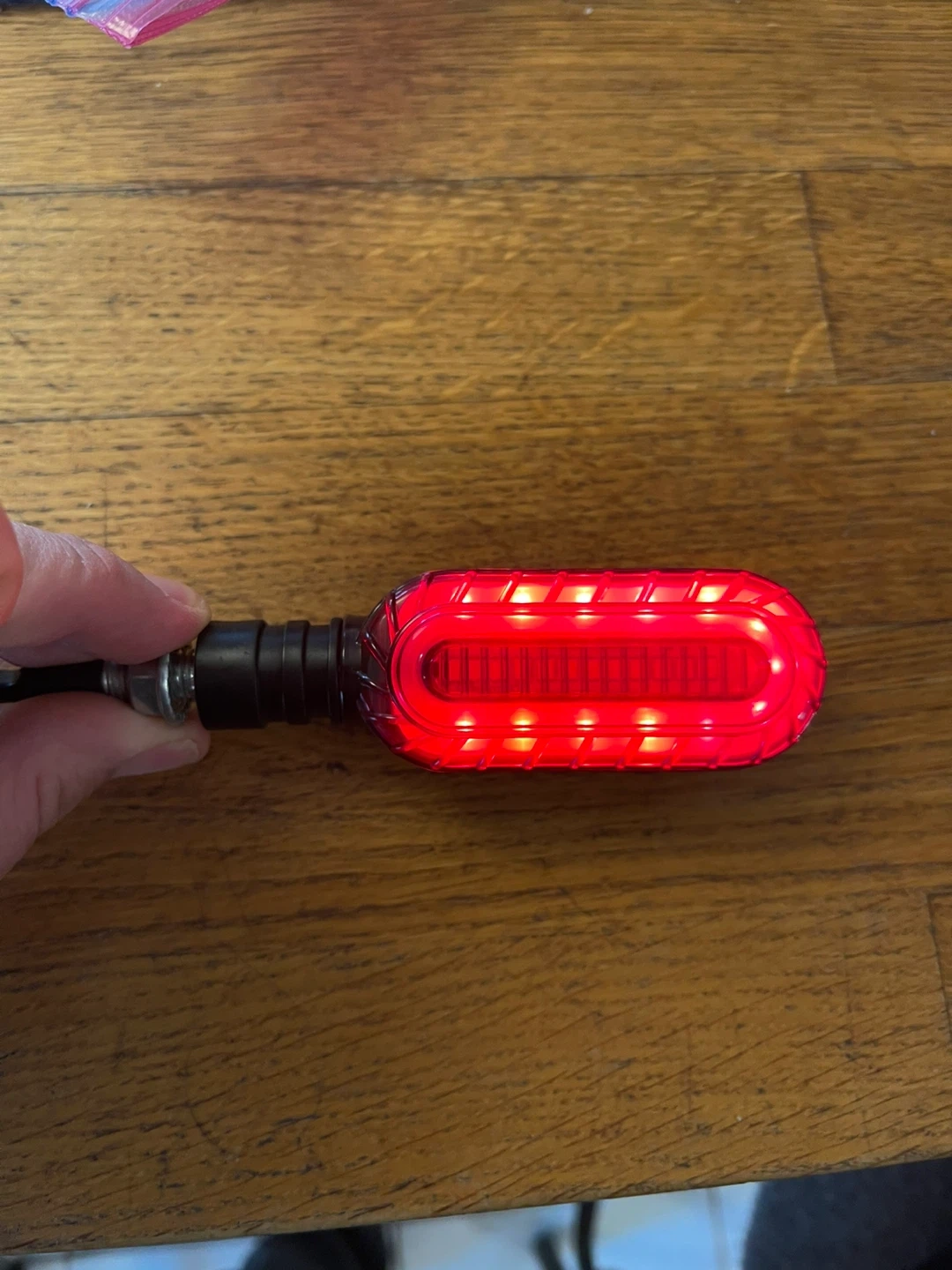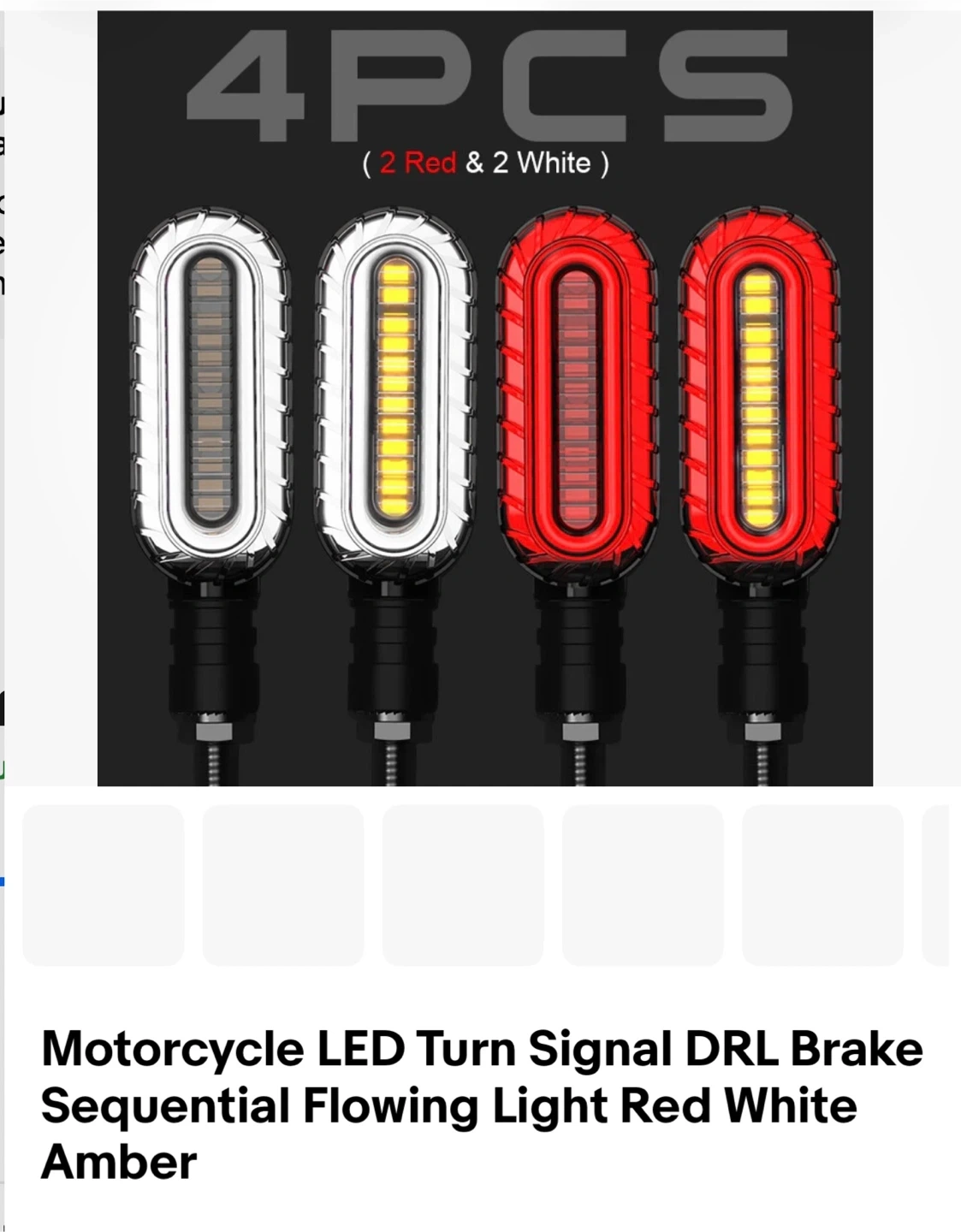 Set of 4 motorcycle LED lights, with 2 red and 2 white units. These lights feature sequential flowing indicators and can function as DRL or brake lights. They're designed with a clear lens and amber, red, or white illumination. Great for enhancing motorcycle visibility and style!