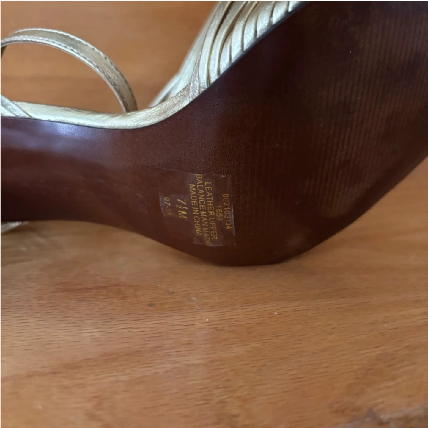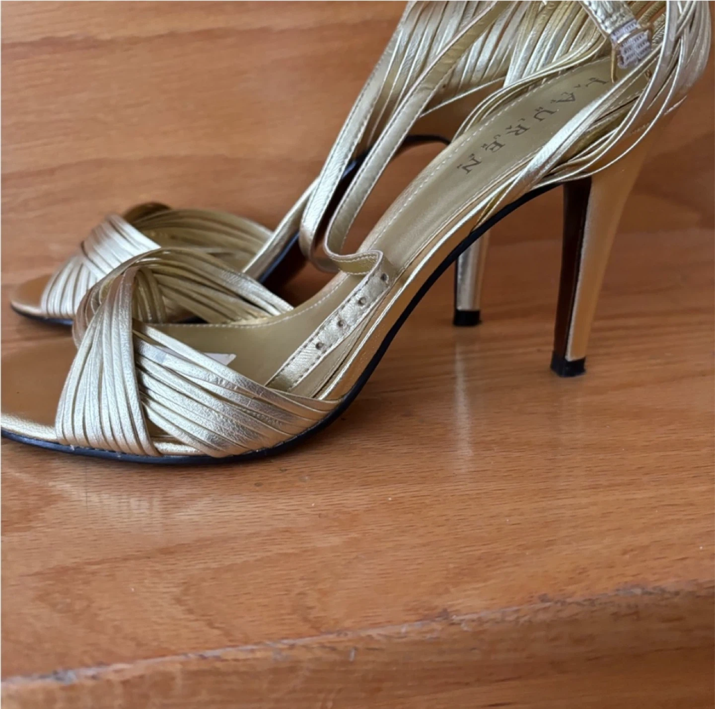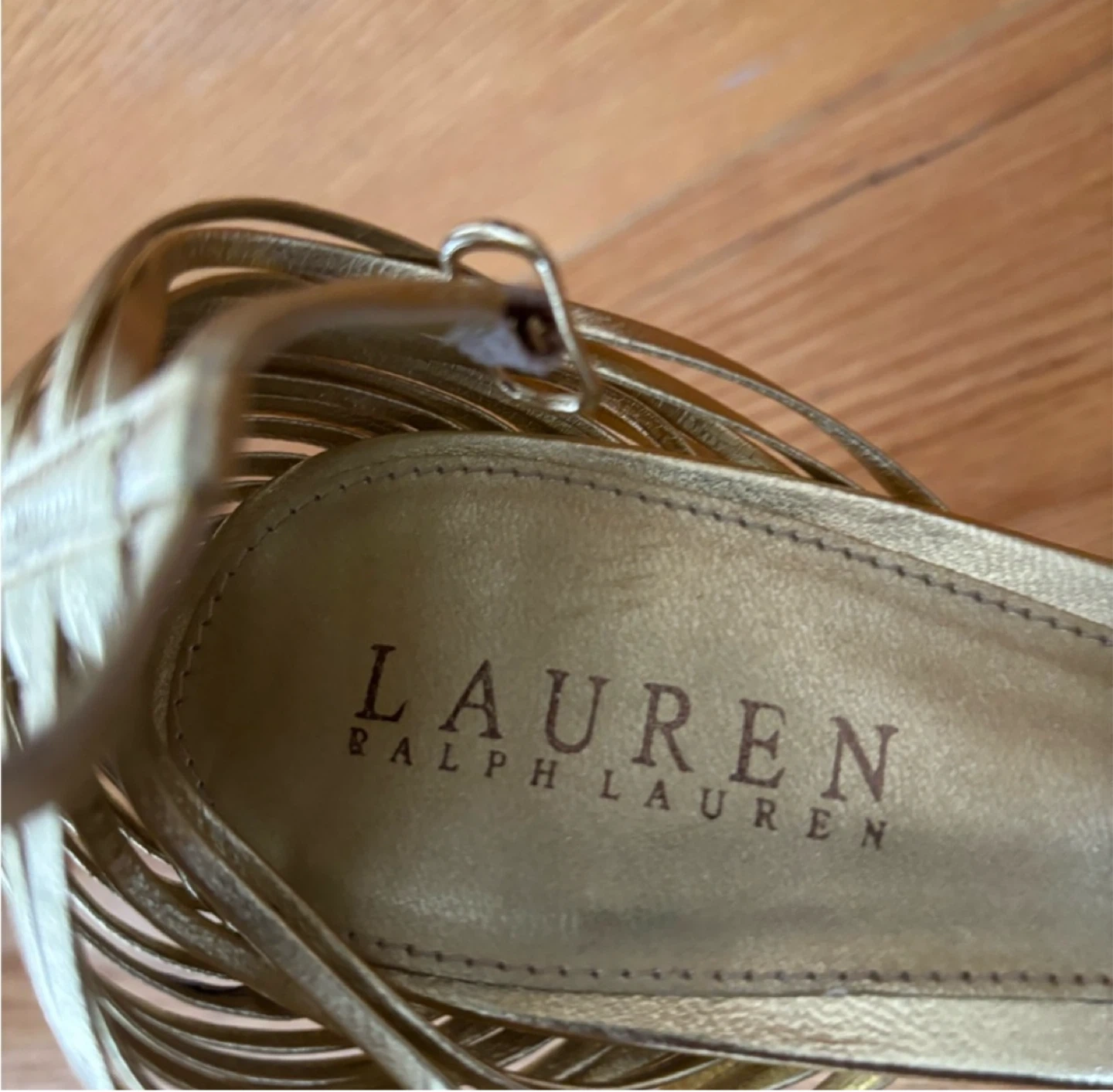 Selling a pair of Ralph Lauren heels in a beautiful gold colour. They are size 7.5M. The upper material is leather.These heels are perfect for a night out or a special occasion!