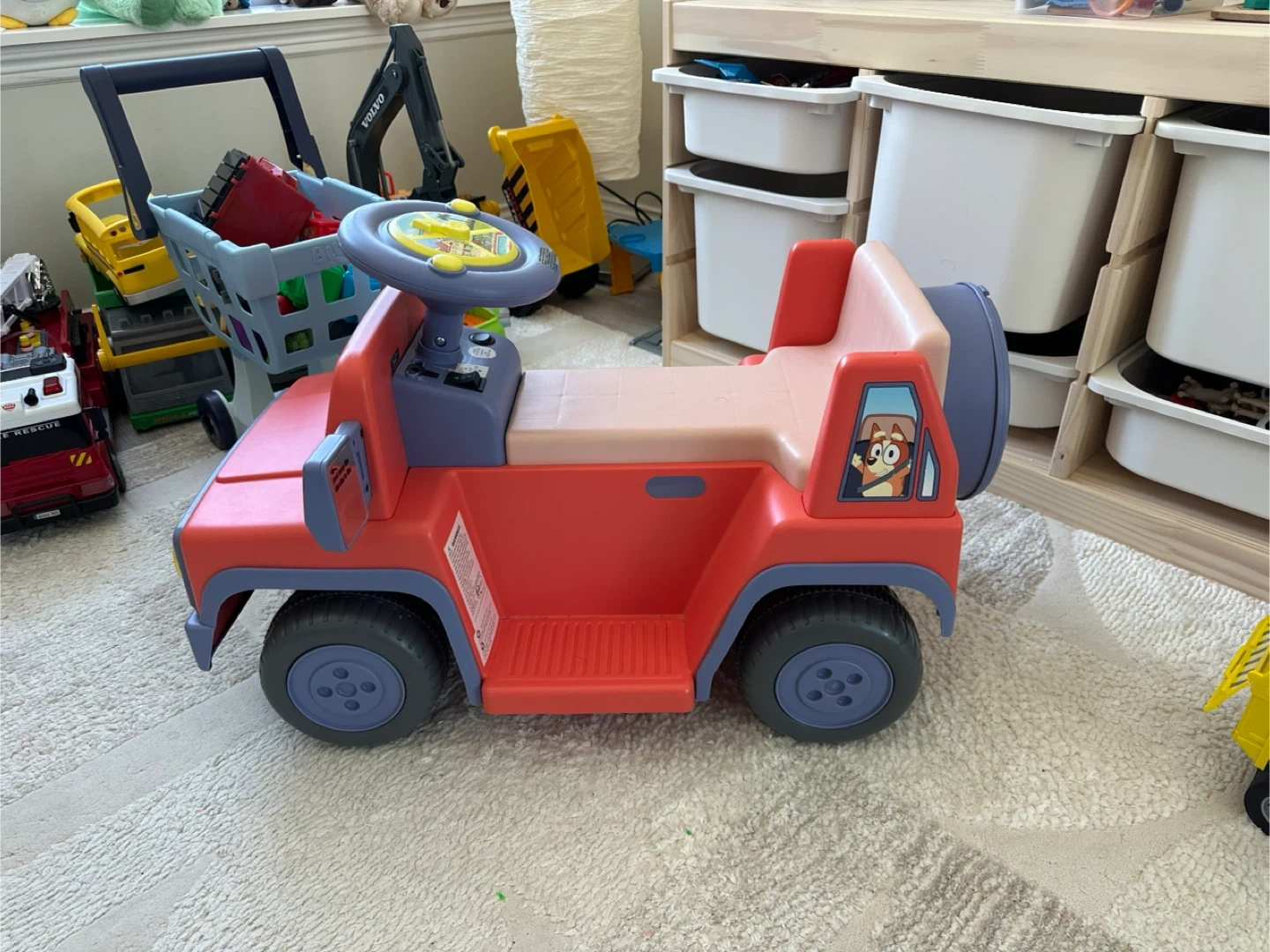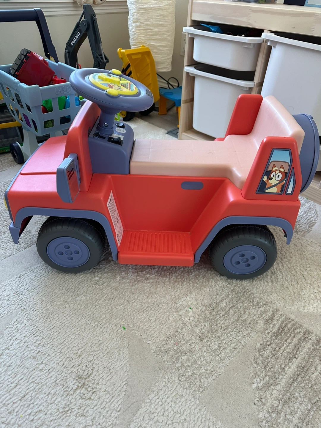 This is a Bluey themed ride-on car for kids. It features a steering wheel and a seat for them to sit on. Perfect for toddlers to push themselves around!