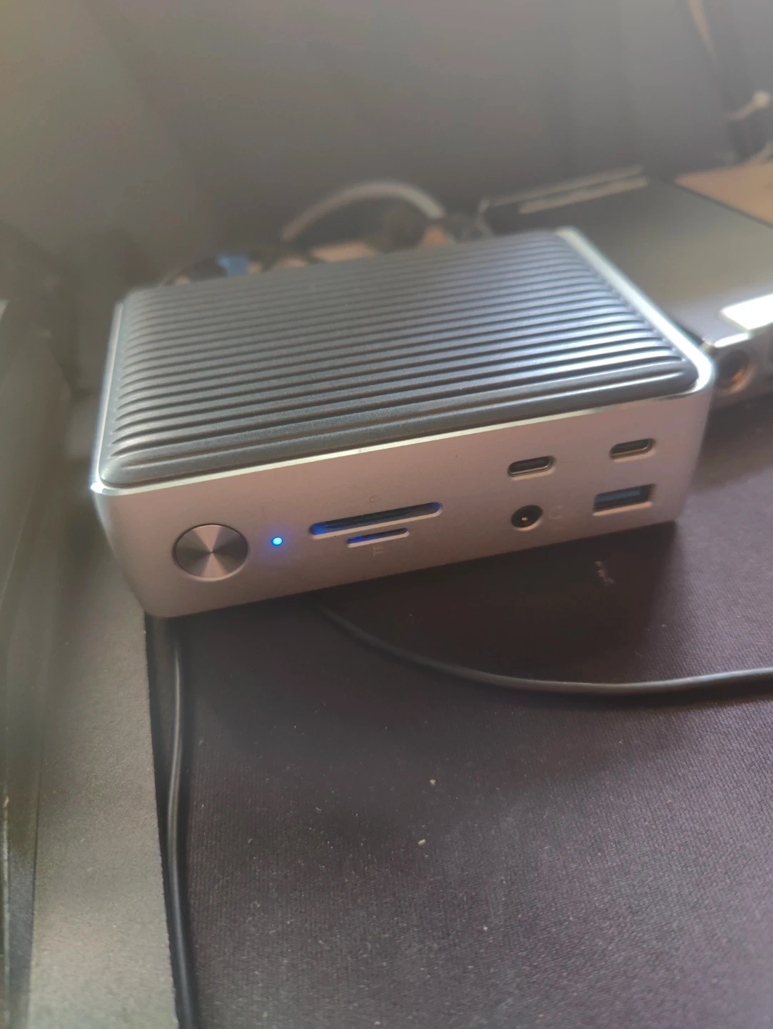 A compact docking station for your PC. It has multiple USB-C and USB-A ports, HDMI, and an SD card reader. This device offers expanded connectivity for your computer!