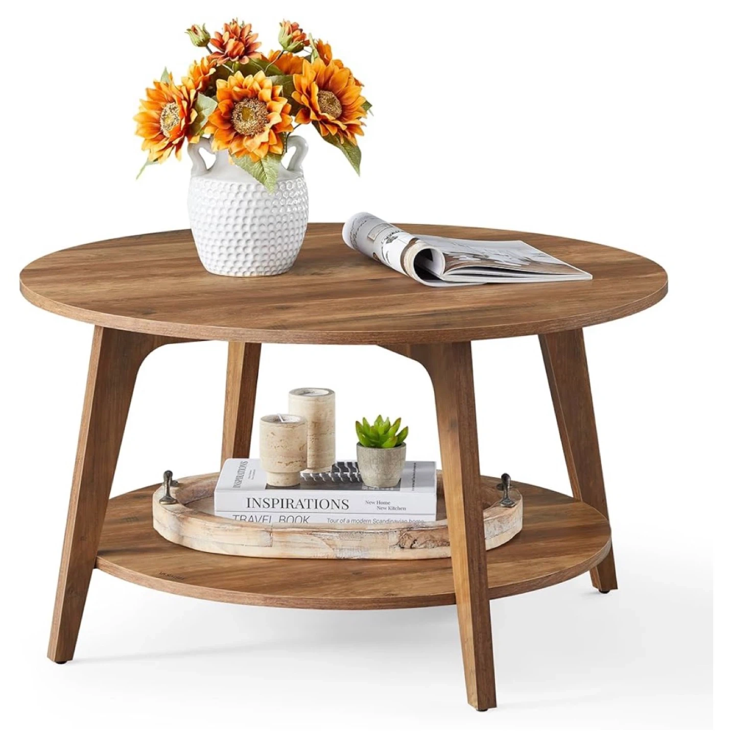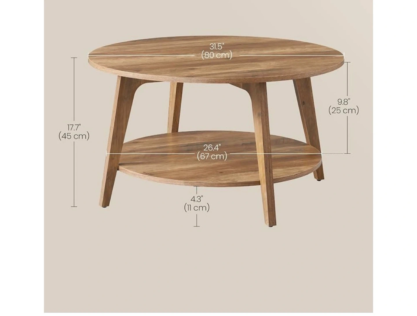 This VASAGLE coffee table features a durable wooden construction with a natural finish. It has a round tabletop and a lower shelf for extra storage space. The dimensions are 31.5" (80 cm) in diameter and 17.7" (45 cm) in height.