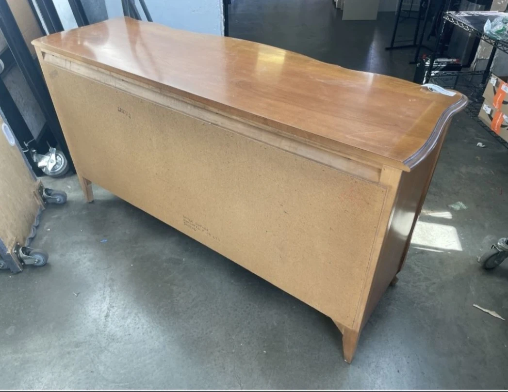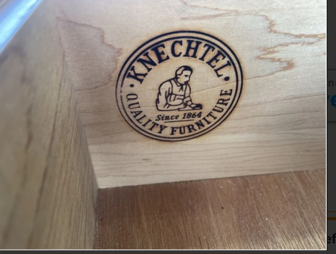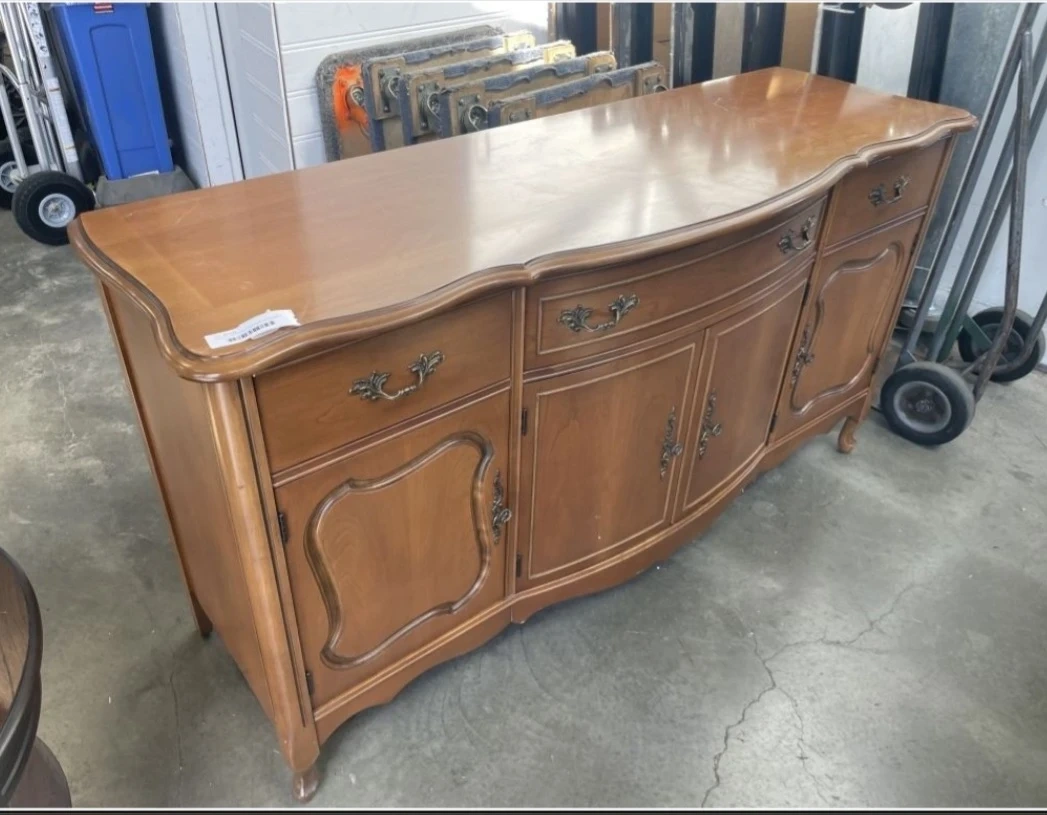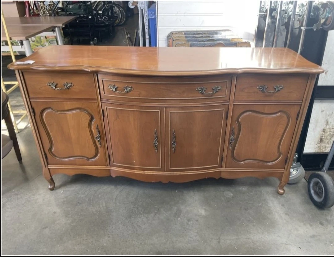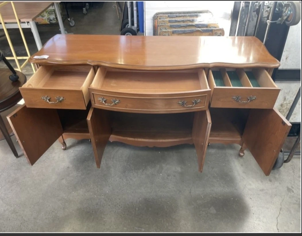 Classic wood buffet by Knechtel. It has three drawers and four cabinet doors. Right drawer has green felt dividers, good for silverware. Decorative hardware is on all drawers and doors. Great for dining room storage or as a credenza. Measurements to follow. Delivery can be arranged. Viewing and pickup by appointment.