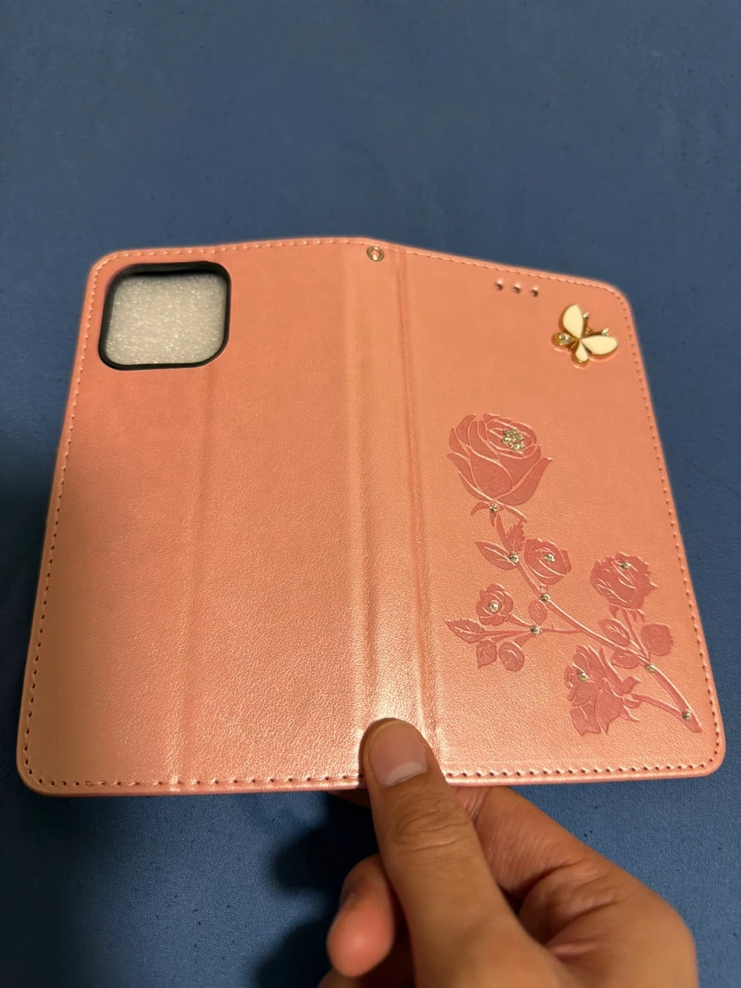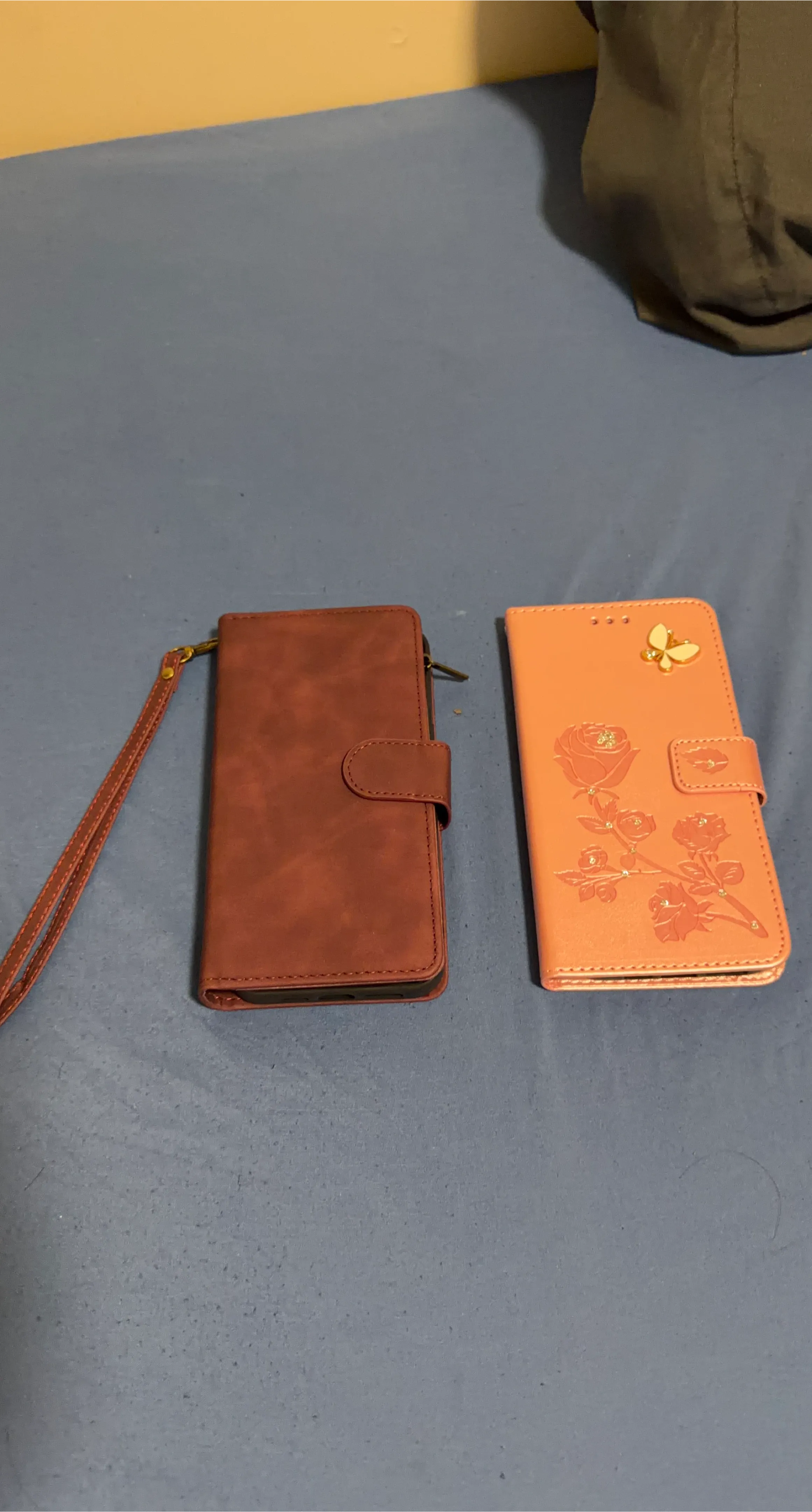 Two stylish wallet cases for phones. One is a rust-coloured faux leather with a zippered coin pouch and wrist strap. The other is a pink case with a floral design and butterfly embellishment. Both cases feature card slots and a secure closure. Keep your essentials organized and your phone protected! $15 each case or both of them for $25