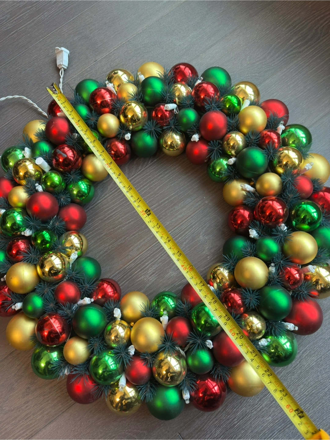 A festive Christmas wreath adorned with red, green, and gold ornaments. It's decorated with faux pine branches and features integrated fairy lights. This wreath measures approximately 22 inches in diameter. It's ready to add some holiday cheer to your home!