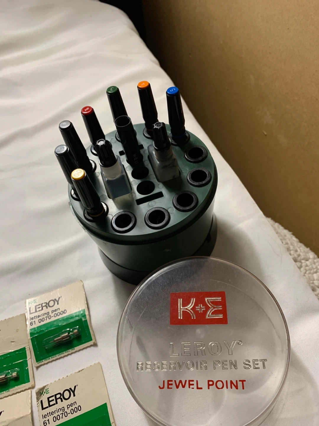 This is a Leroy Reservoir Pen Set, Jewel Point. It comes with multiple lettering pens and ink. This set is ideal for technical drawing and drafting projects.