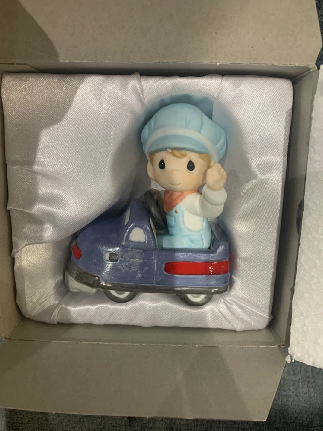 This is a Precious Moments figurine of a young boy in a blue car. It's made of porcelain. Comes with original box and white satin lining.