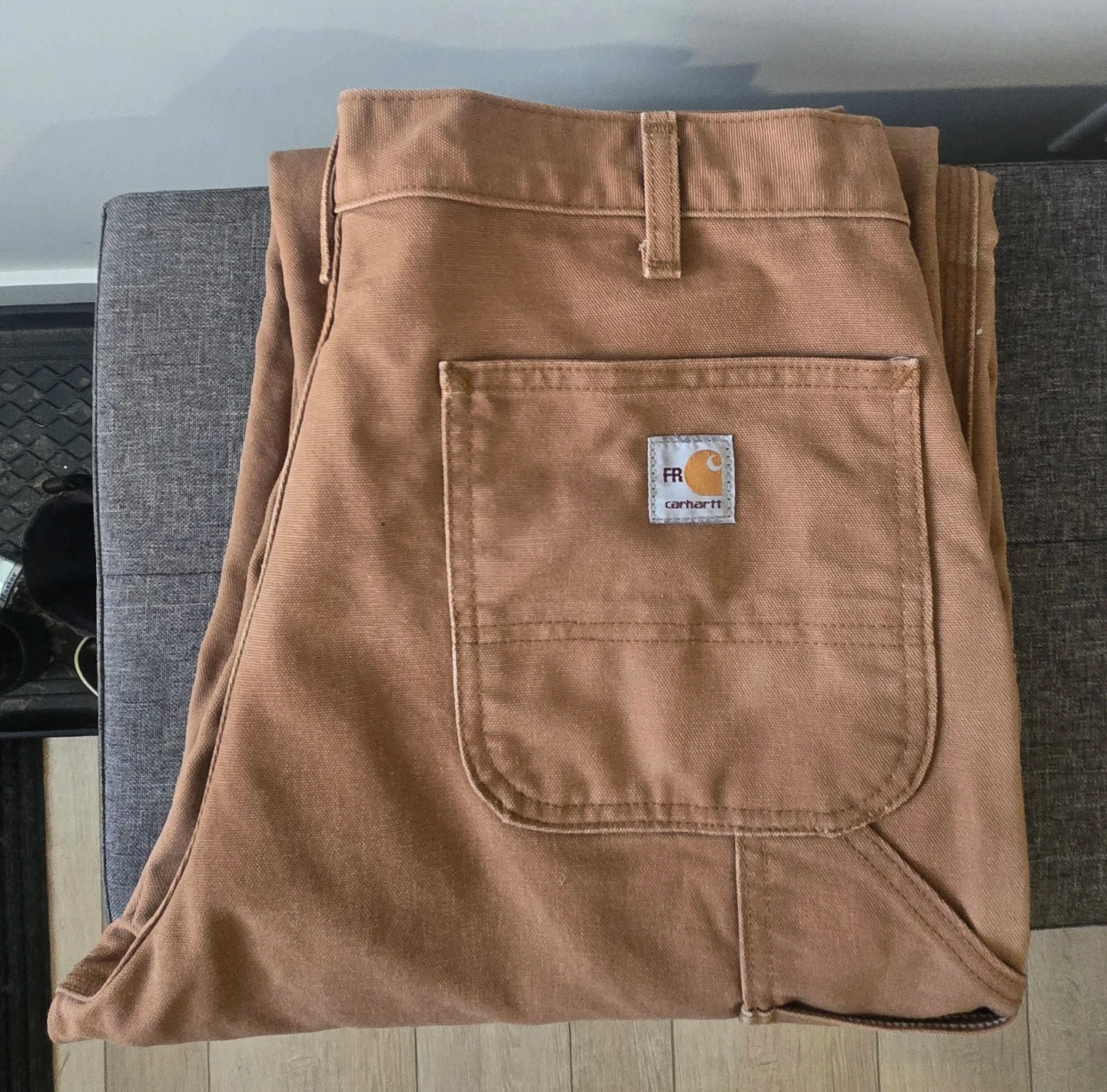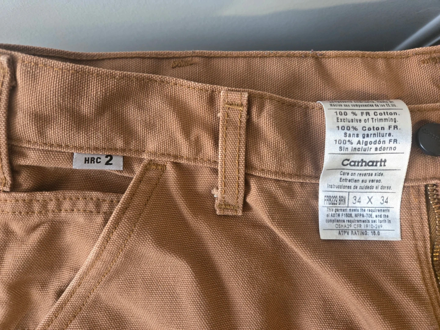 These Carhartt FR work pants are made from 100% cotton. They're size 34x34 and brown in colour. These pants have never been worn. Bought the wrong size for my husband. Too late to return by the time we got home.