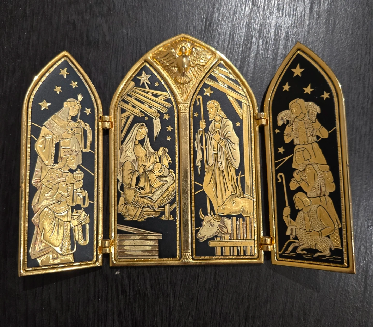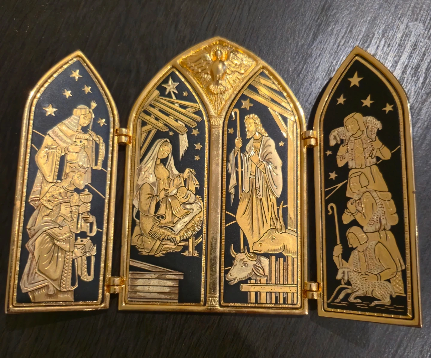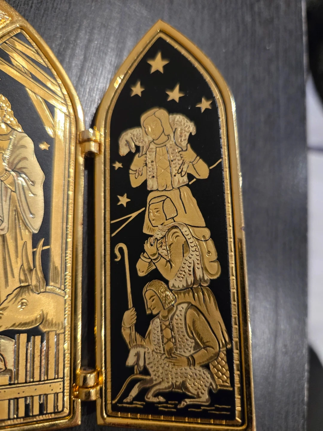 This Beautiful Rare Triptych is hand inlaid with 22Kt yellow thread and 18kt green, if it represents the Nativity scene.