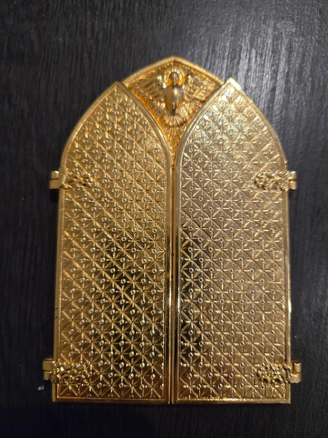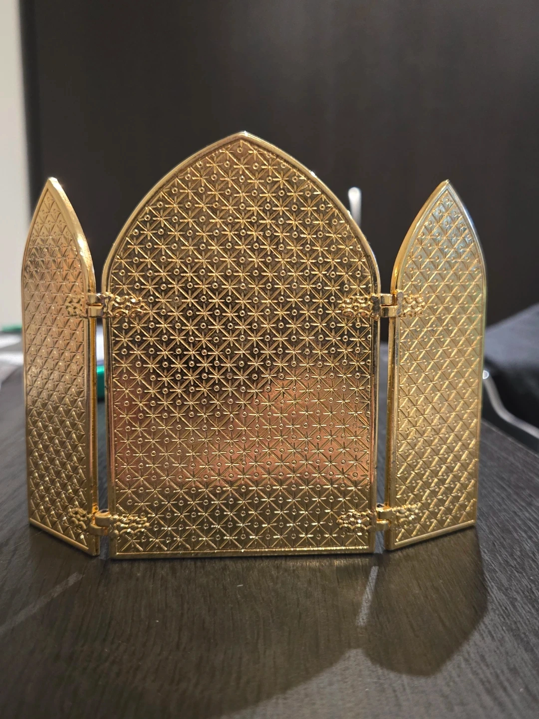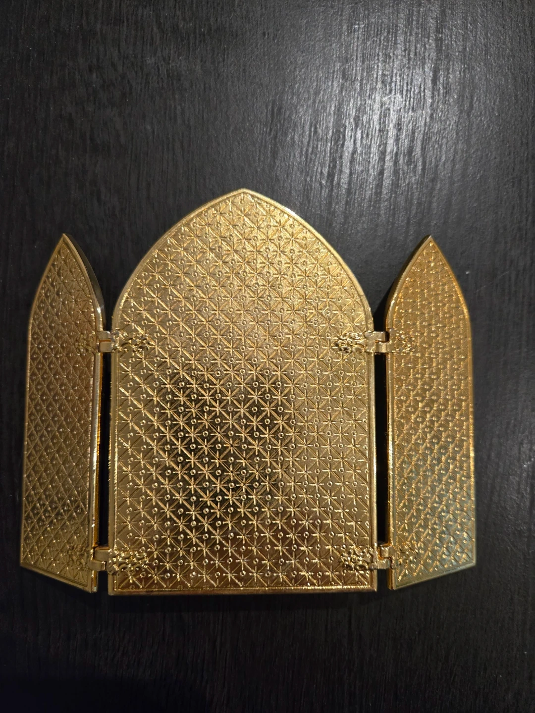 This Beautiful Rare Triptych is hand inlaid with 22Kt yellow thread and 18kt green, if it represents the Nativity scene.