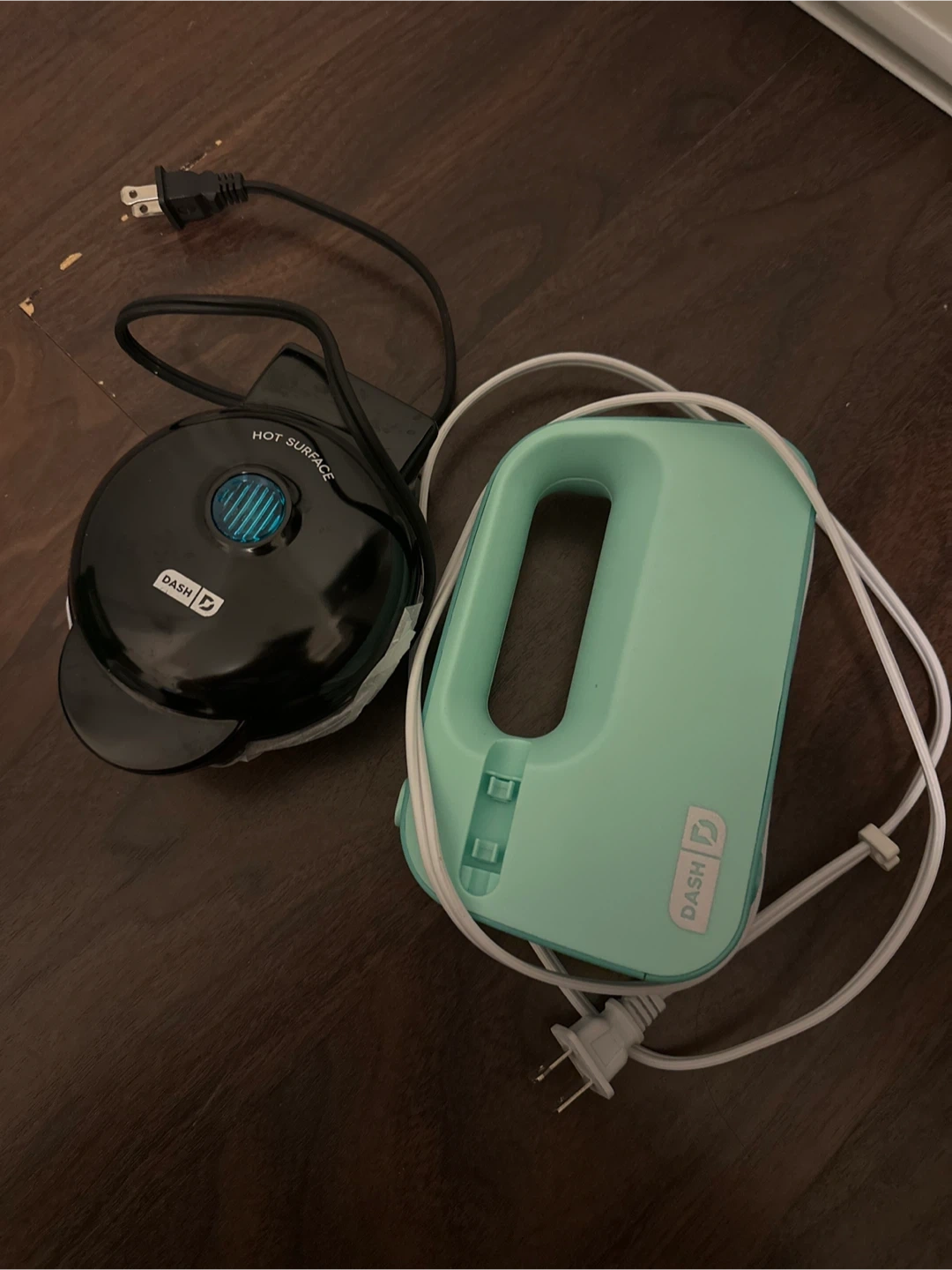 Bundle includes a Dash mini waffle maker and a teal Dash hand mixer. Both appliances are compact and easy to store. This set is great for quick breakfasts or baking projects!