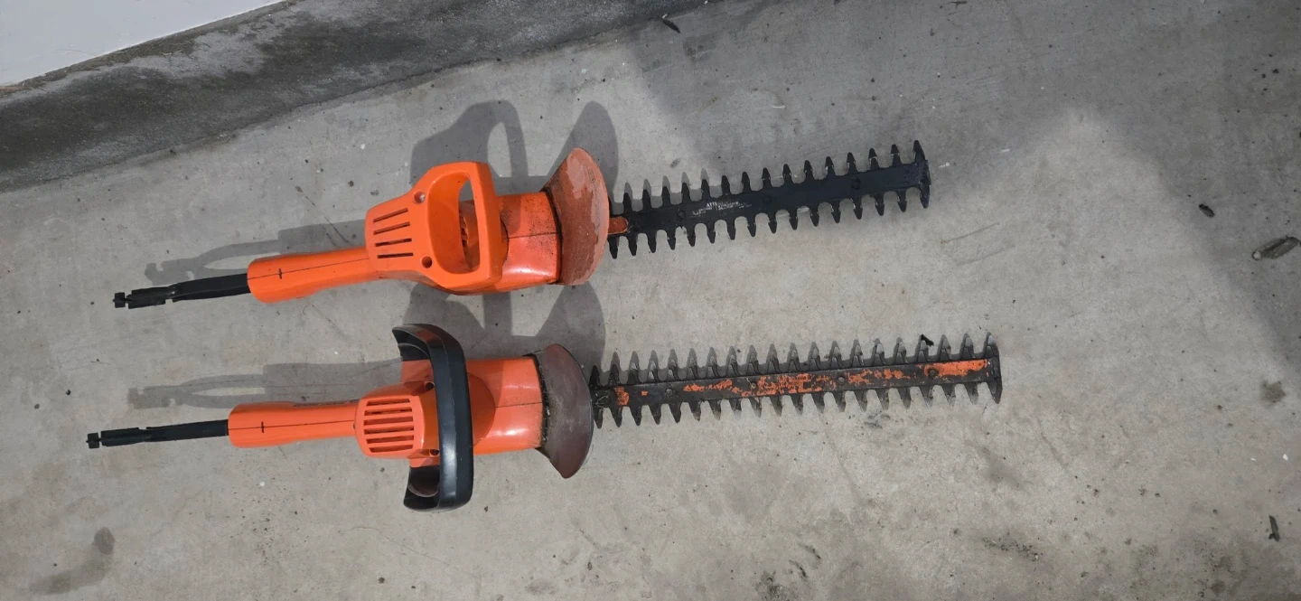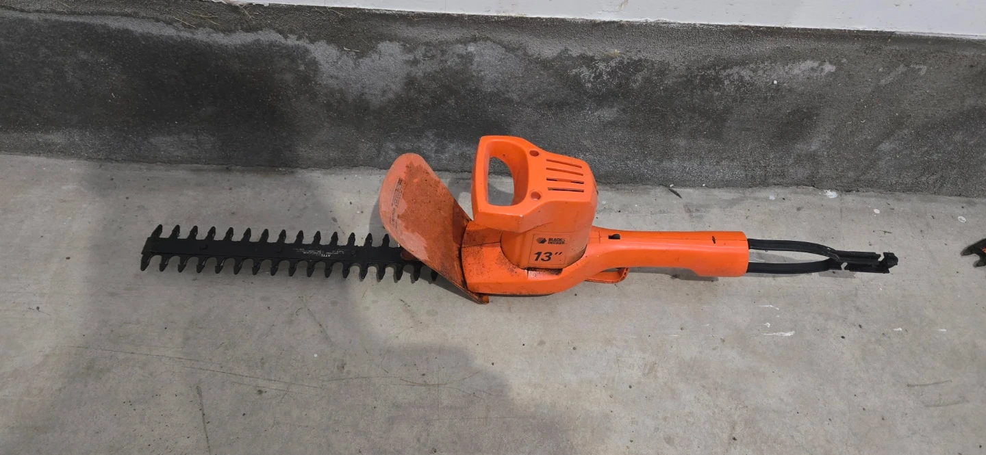 This Black & Decker electric hedge trimmer features a 13-inch blade. It's orange and black, designed for trimming hedges. This tool is useful for yard maintenance.