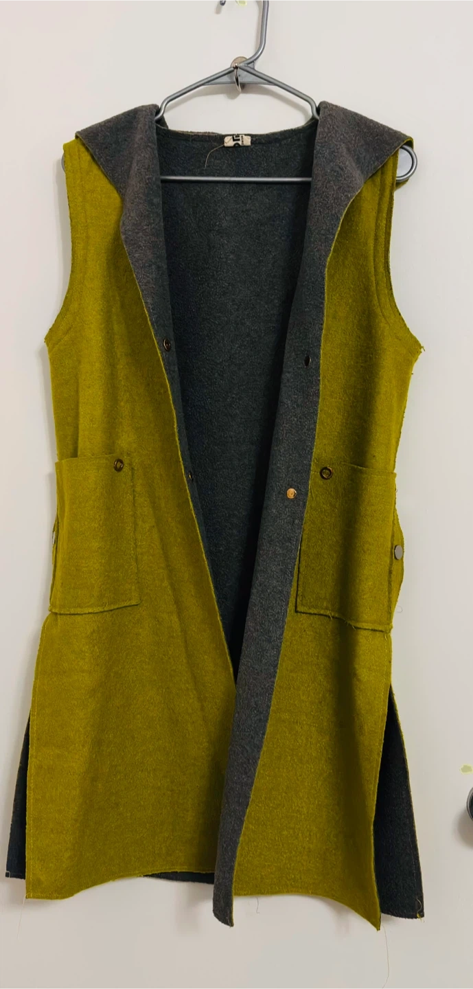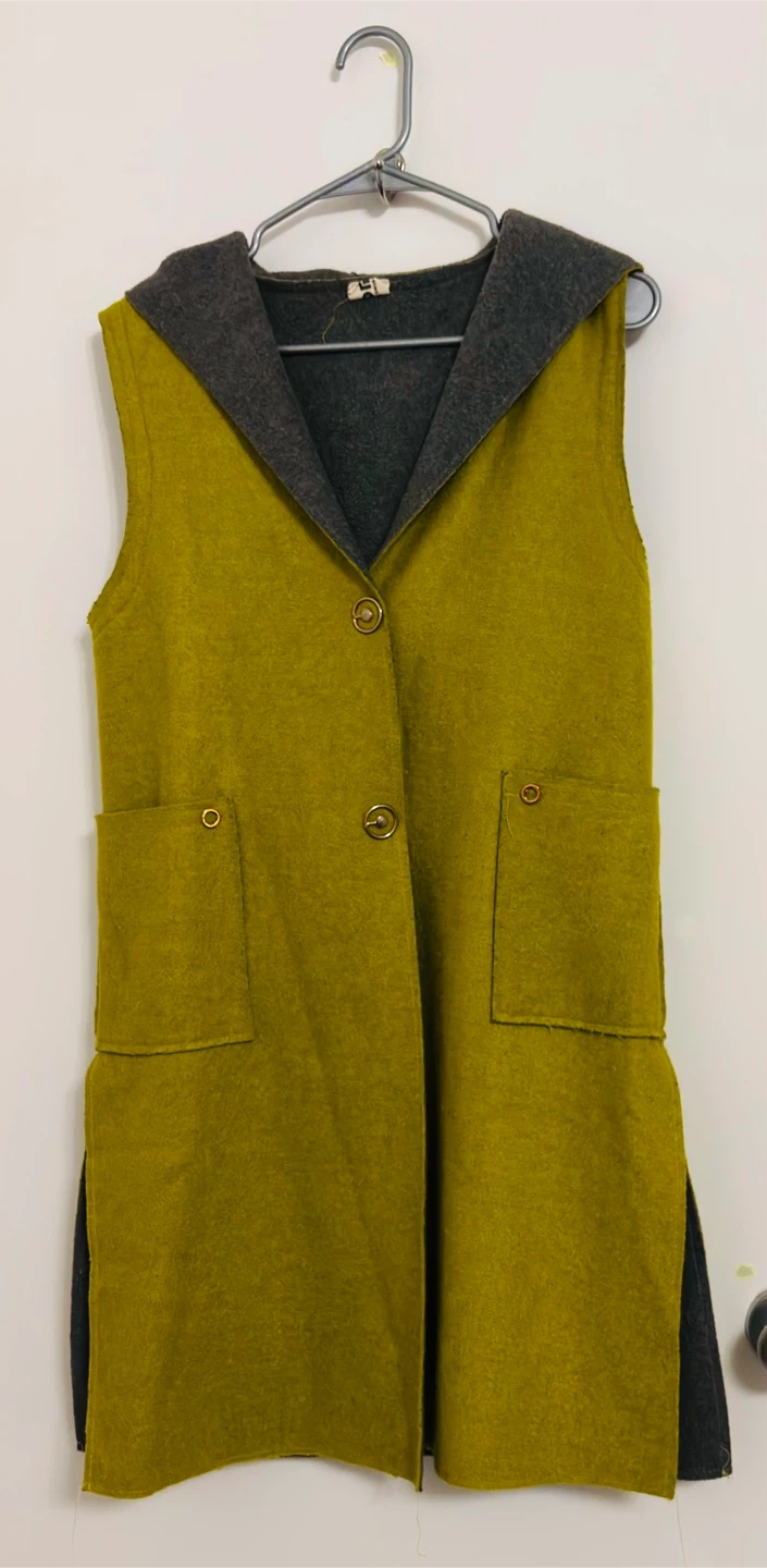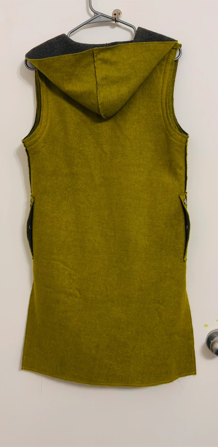 This reversible sleeveless vest features a hooded design, two front pockets, and a button-up closure. One side is olive green, and the other is charcoal grey. It's made of a felt-like material.