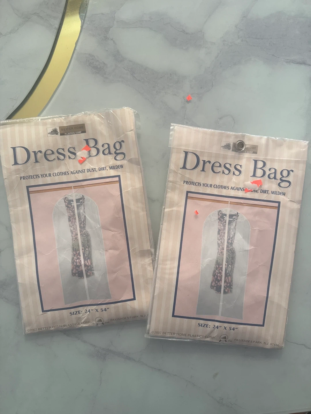 Protects clothing from dust, dirt, and mildew. Each bag measures 24" x 54". Includes zipper closure.