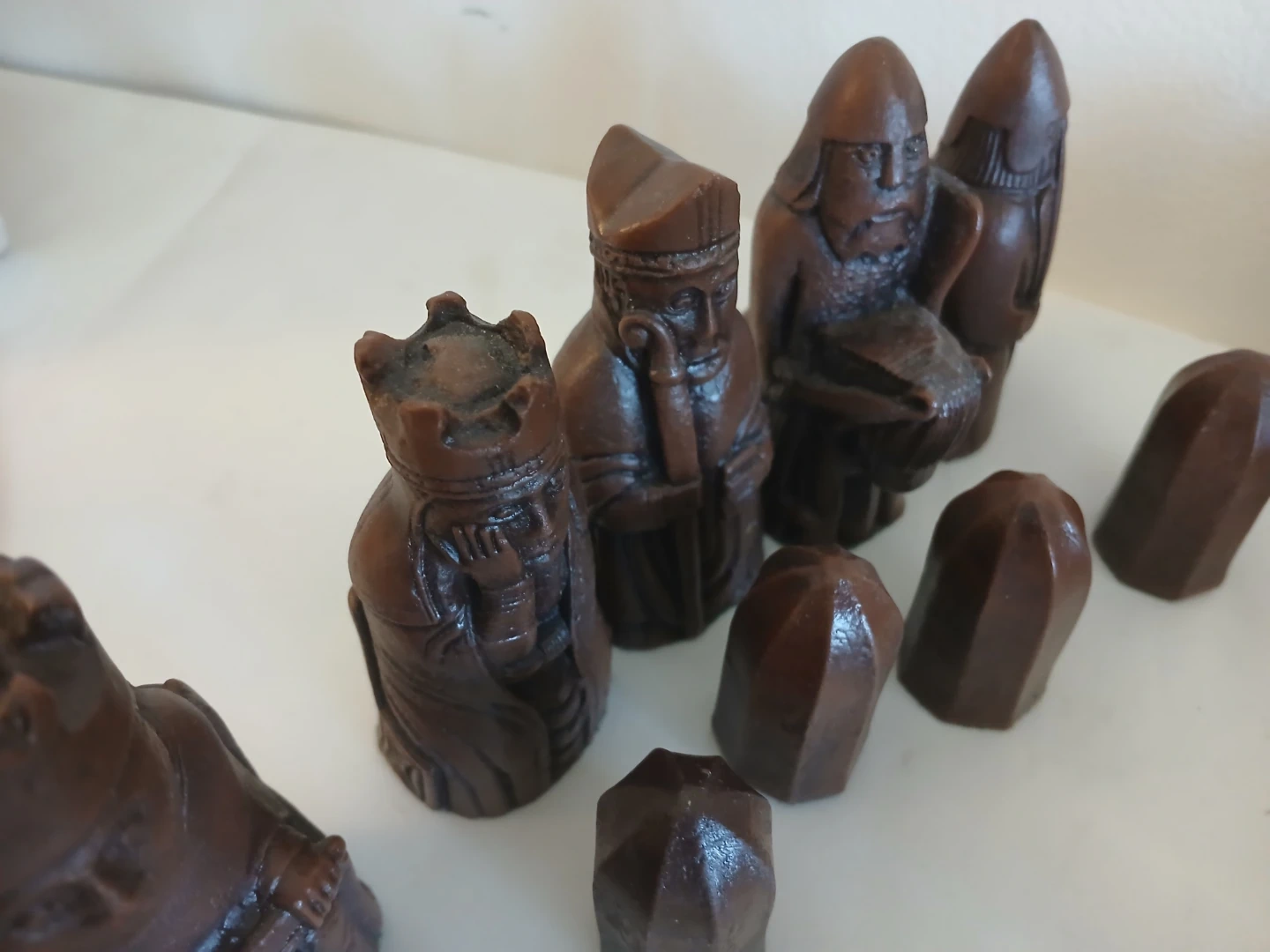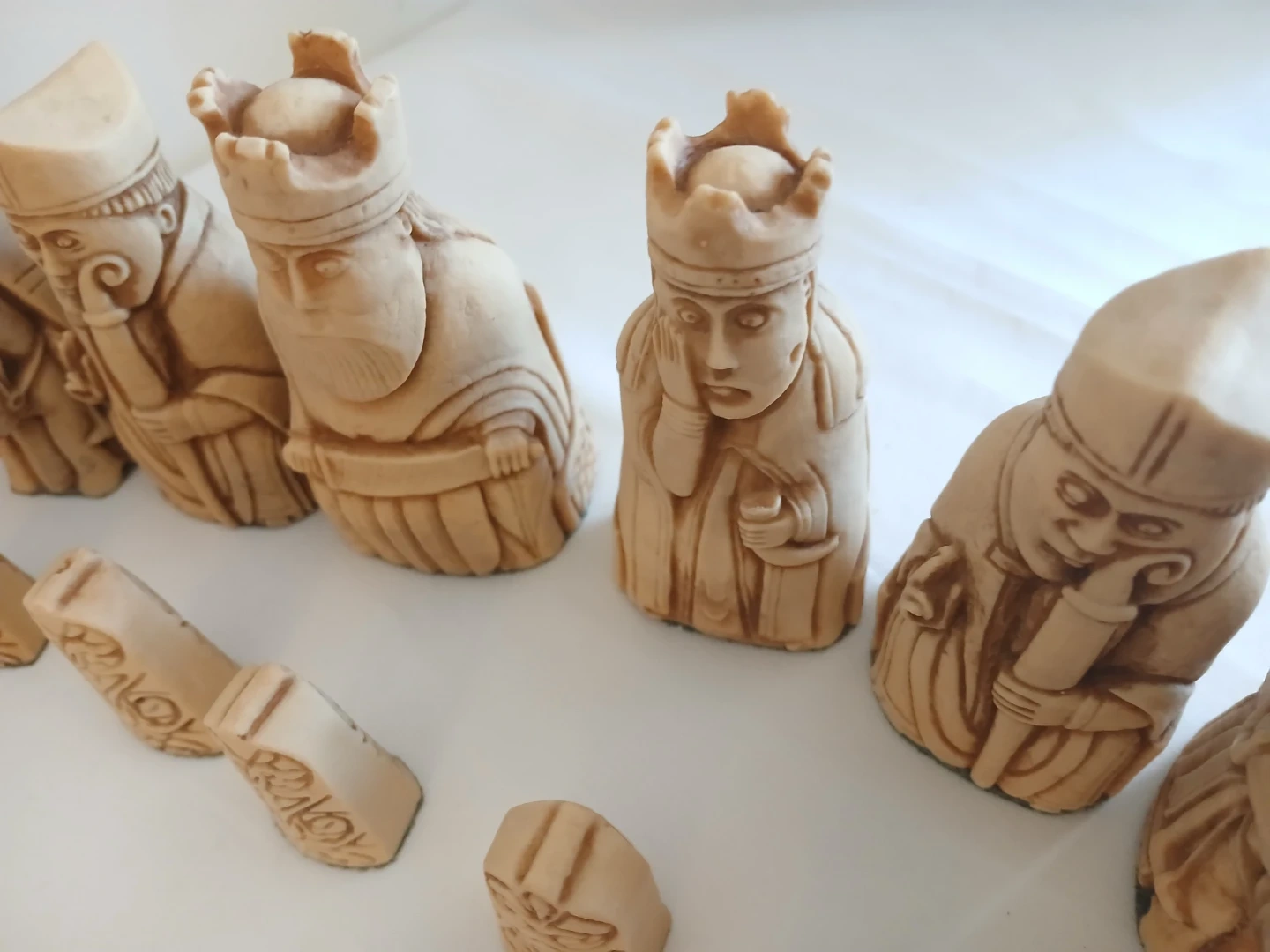A unique set of reproduction medieval Isle of Lewis chess pieces. Mimics 12th century walrus ivory or whale bone. Probably resin. It's a full set for two players, with distinct designs for each side black and ivory. These pieces are suitable for display or a game of chess!