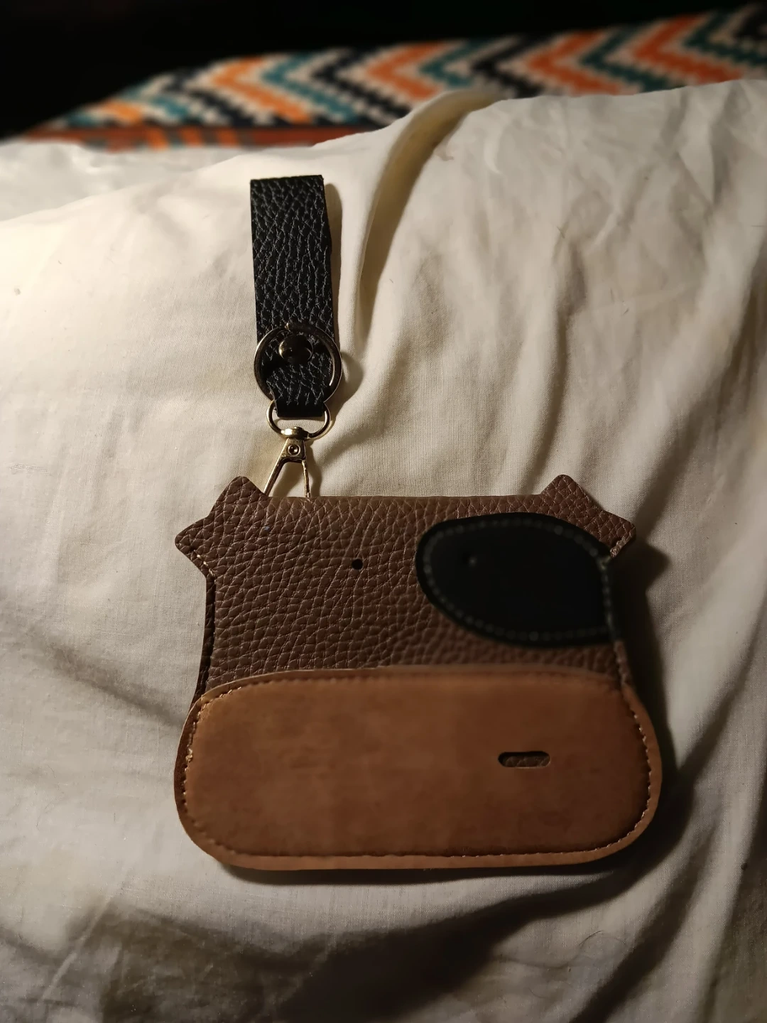 Cute cow-shaped coin purse made from faux leather. It has a snap closure and a ring with a strap for easy attachment. Perfect for carrying small items like coins, earbuds, or lip balm!