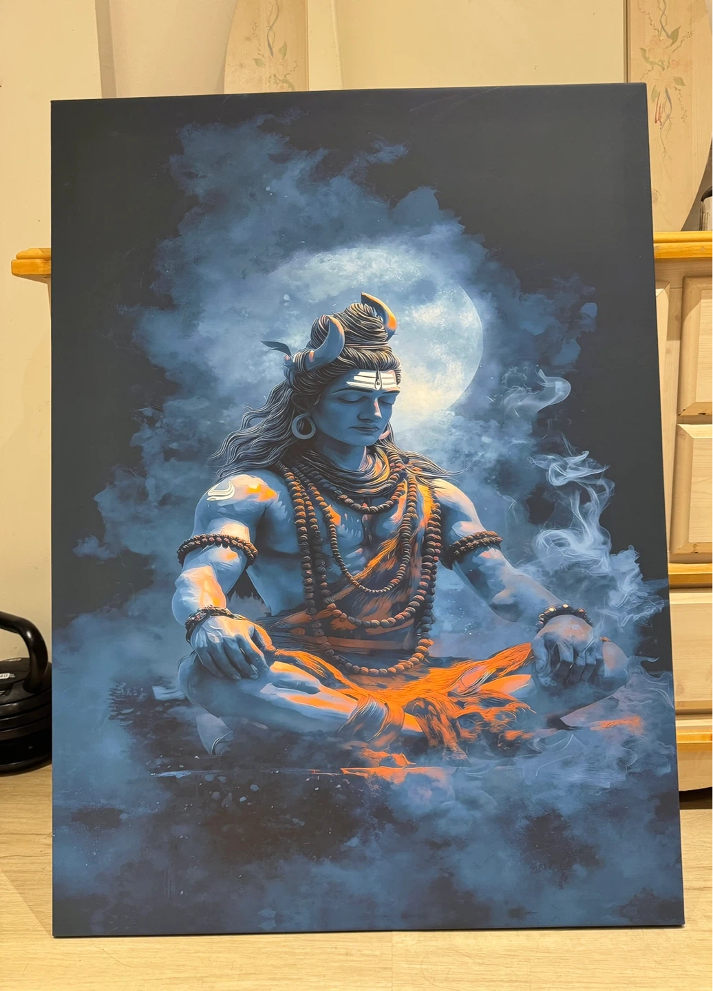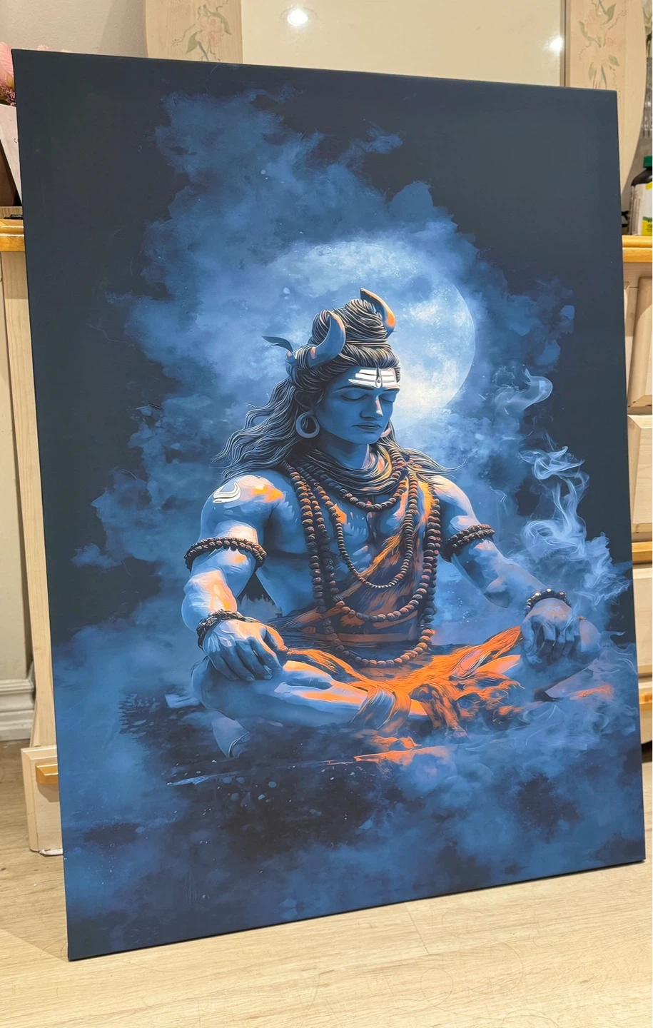 Vibrant canvas print featuring Lord Shiva in a meditative pose against a moonlit, smoky background. This artwork showcases striking blue and orange tones. Perfect for adding a spiritual and artistic touch to your home decor!