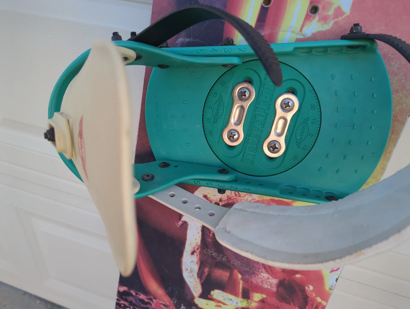 This is a Ride snowboard with bindings attached. It has a colourful graphic design on the underside. Bindings are adjustable for a secure fit.