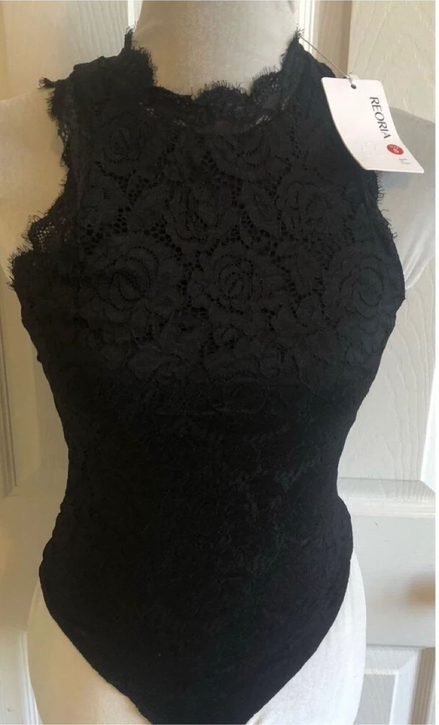 This is a black lace halter bodysuit. It's made of a stretchy lace material with a floral pattern. The neckline has a scalloped lace trim. Run small