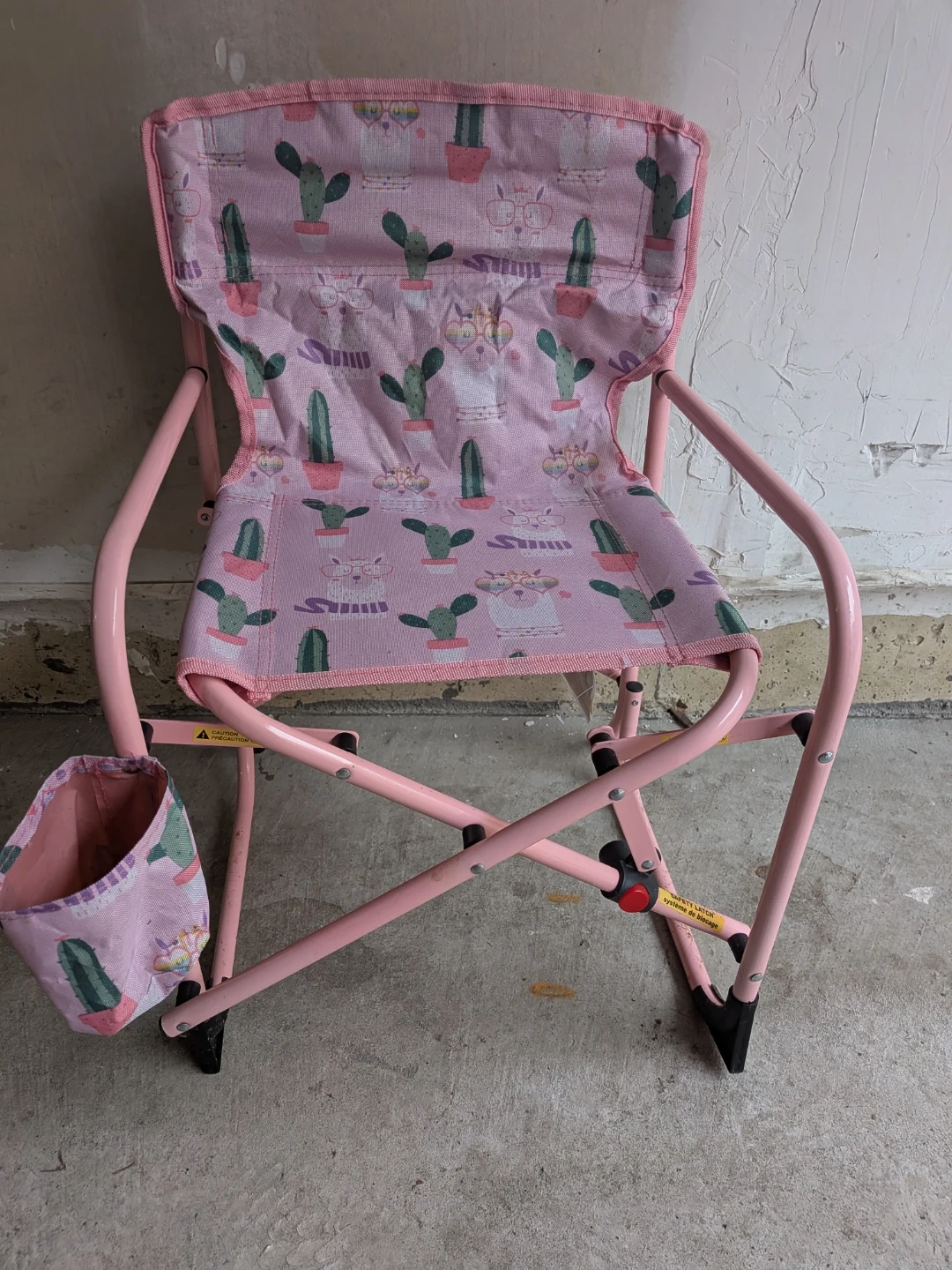 This cute pink folding chair features a fun cactus and cat pattern. It includes a convenient cup holder on the side. Lightweight and easy to carry, it's great for backyard camping or lounging!
