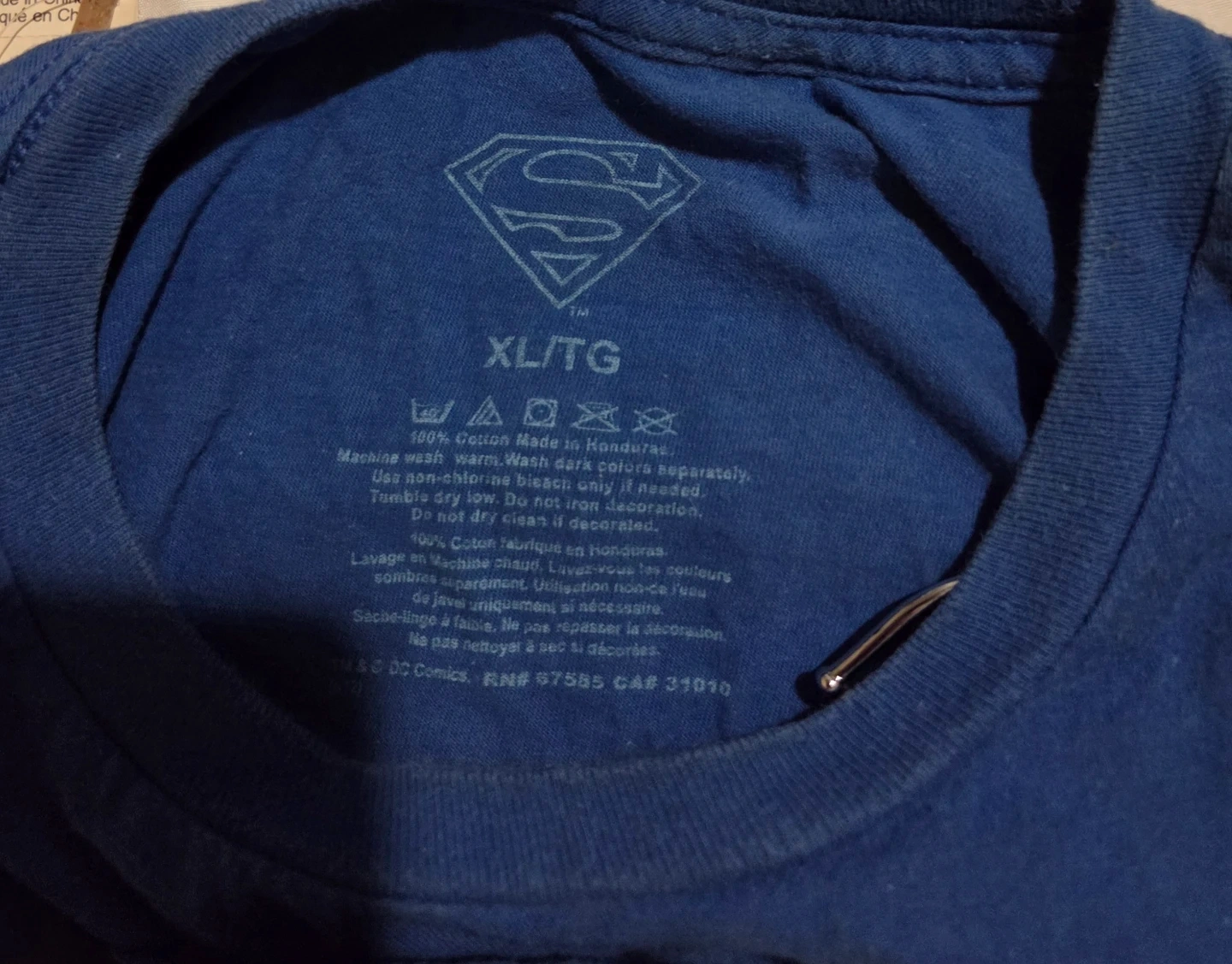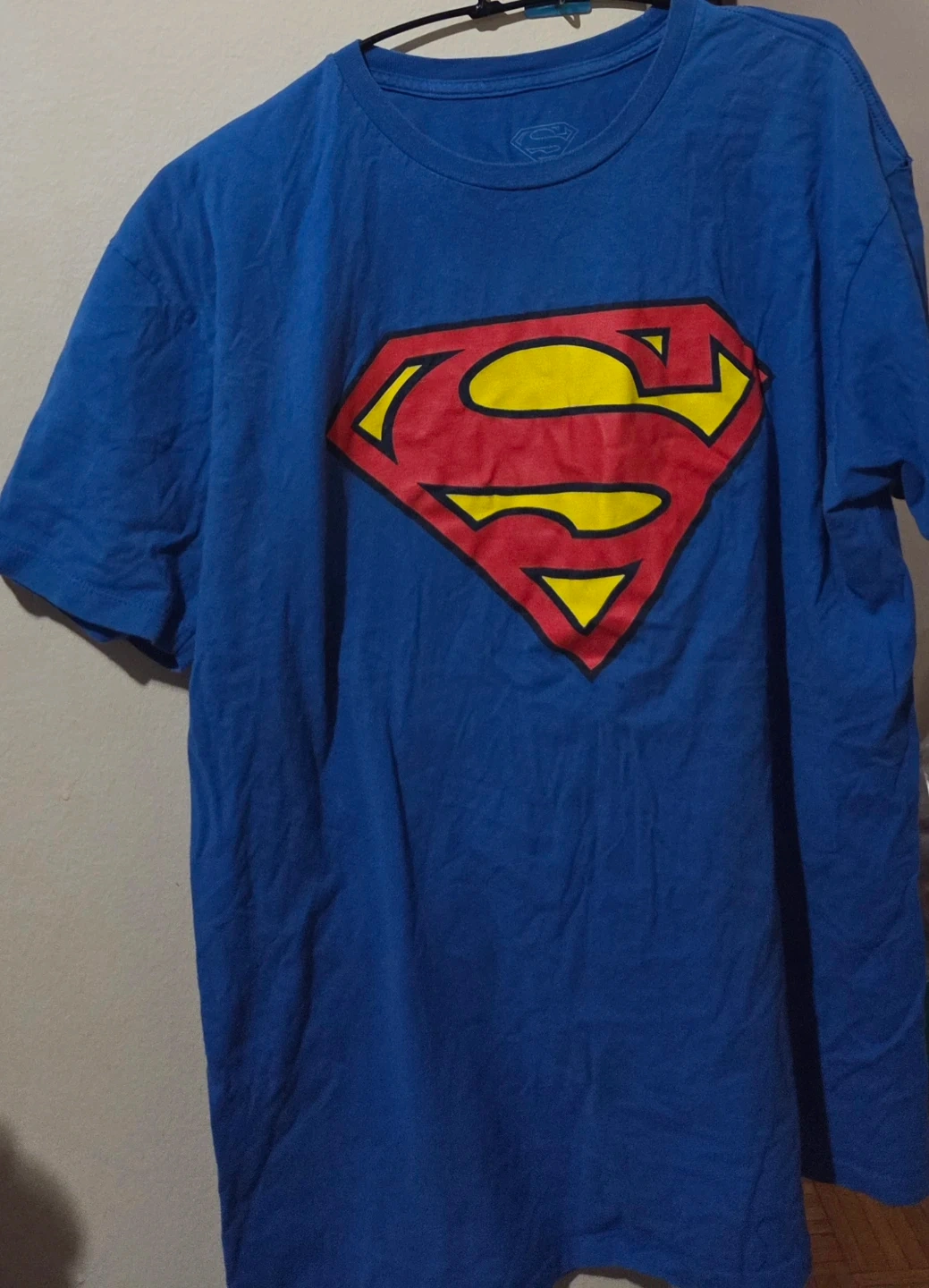 Blue Superman graphic t-shirt with the iconic 'S' logo. Made from 100% cotton in Honduras. Machine wash warm, wash dark colors separately. Use non-chlorinated bleach only if needed. Tumble dry low, do not iron decoration. Unisex
