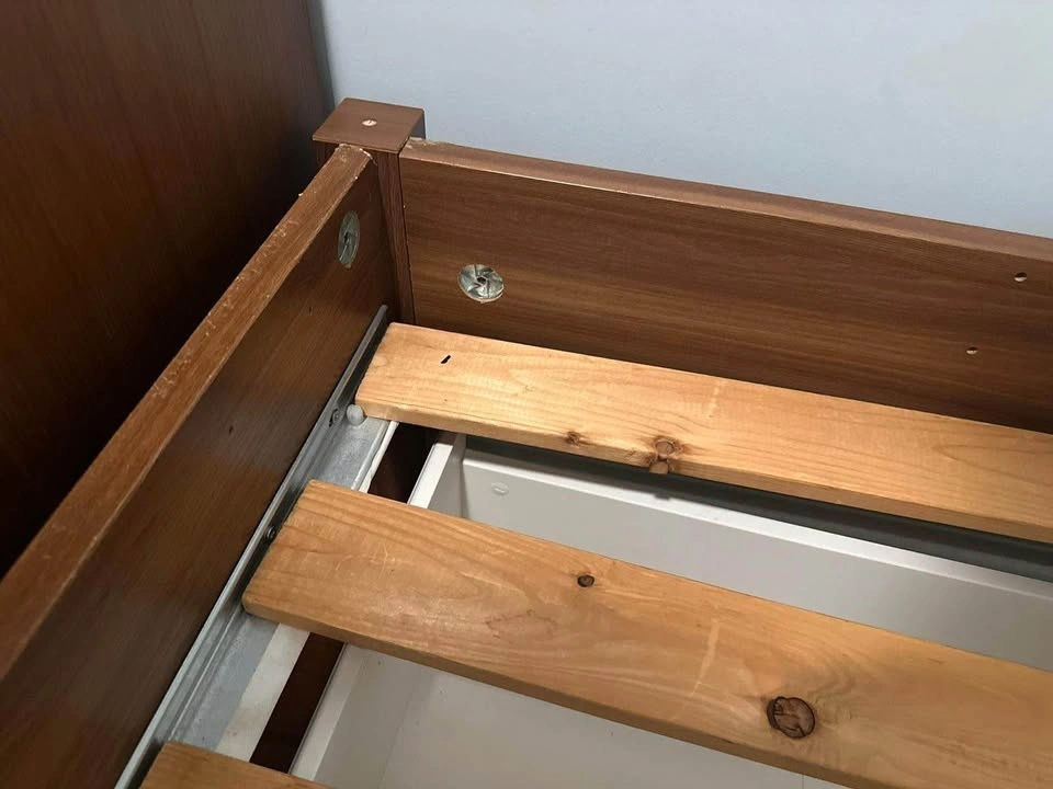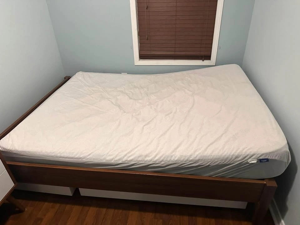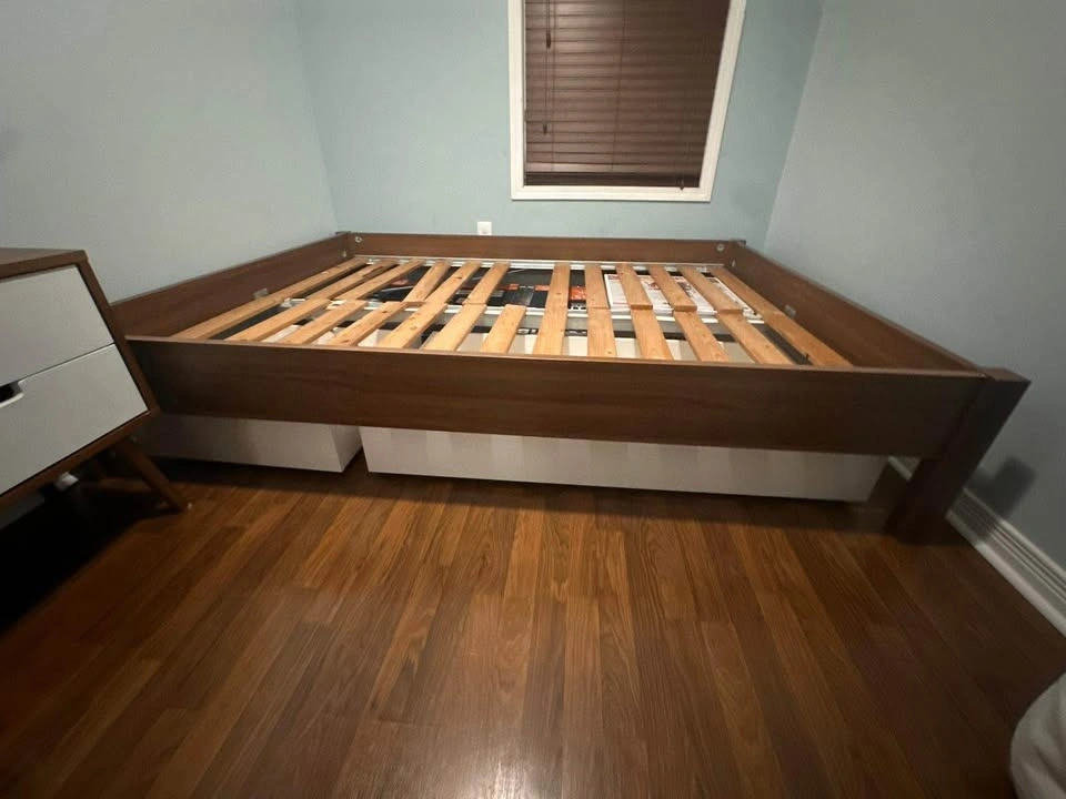 Queen size wooden bed-frame. It is in very good condition, does not squeak or rock. Has slight imperfections.