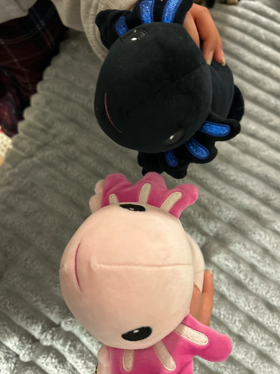 Two cute axolotl plush toys, one pink and one black. They're soft and cuddly! Got these originally for 20 EACH.