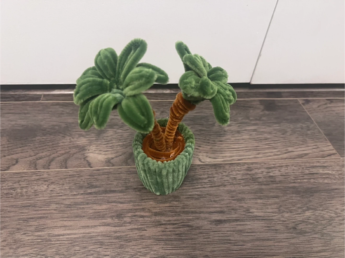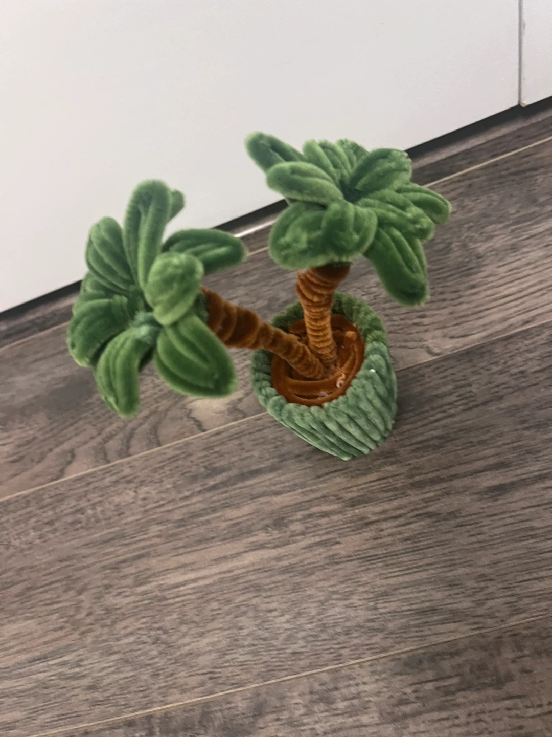 Cute pipe cleaner palm tree in a fuzzy green pot. Adds a touch of tropical flair to any space. It's great for desks or shelves!