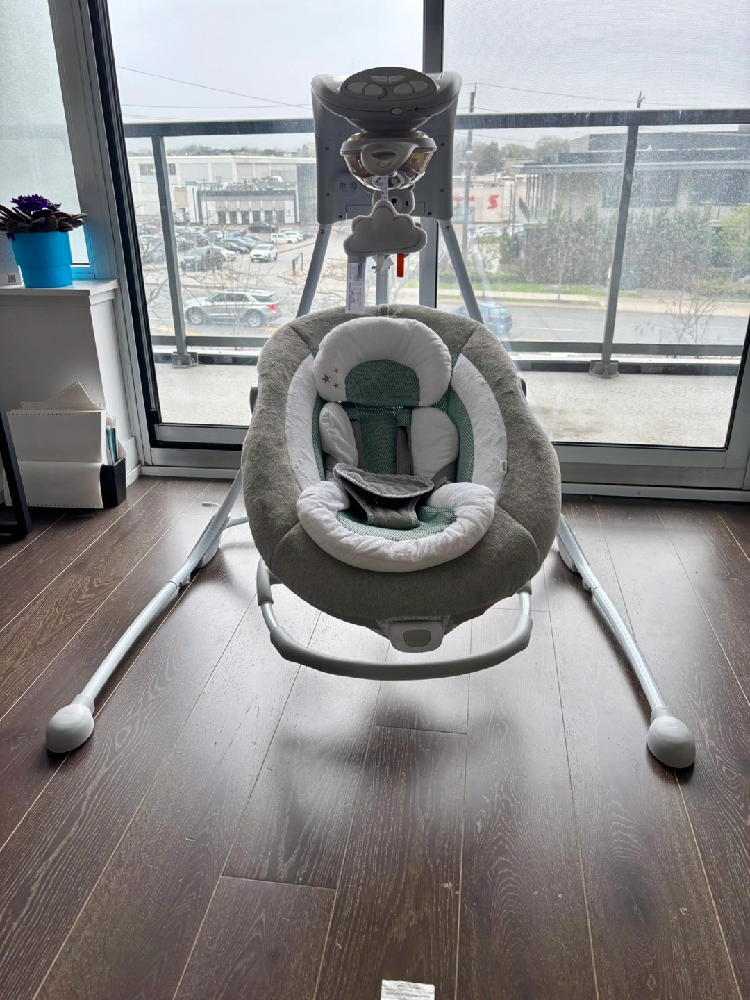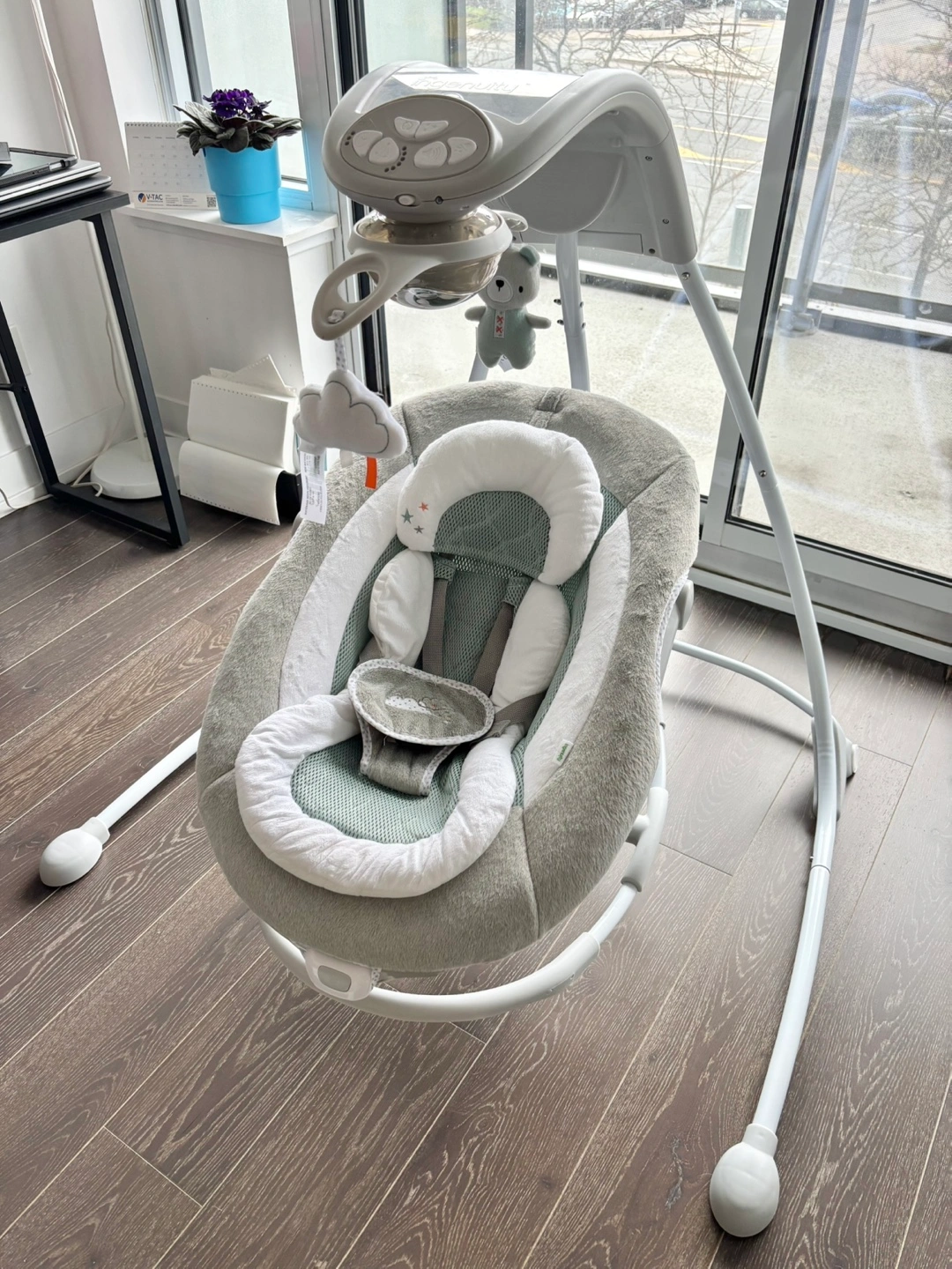 Baby swing, grey and green colour scheme. Features multiple settings, including swinging, vibration, and sounds. Mobile with plush toys included. Gently used. Original price $242.91