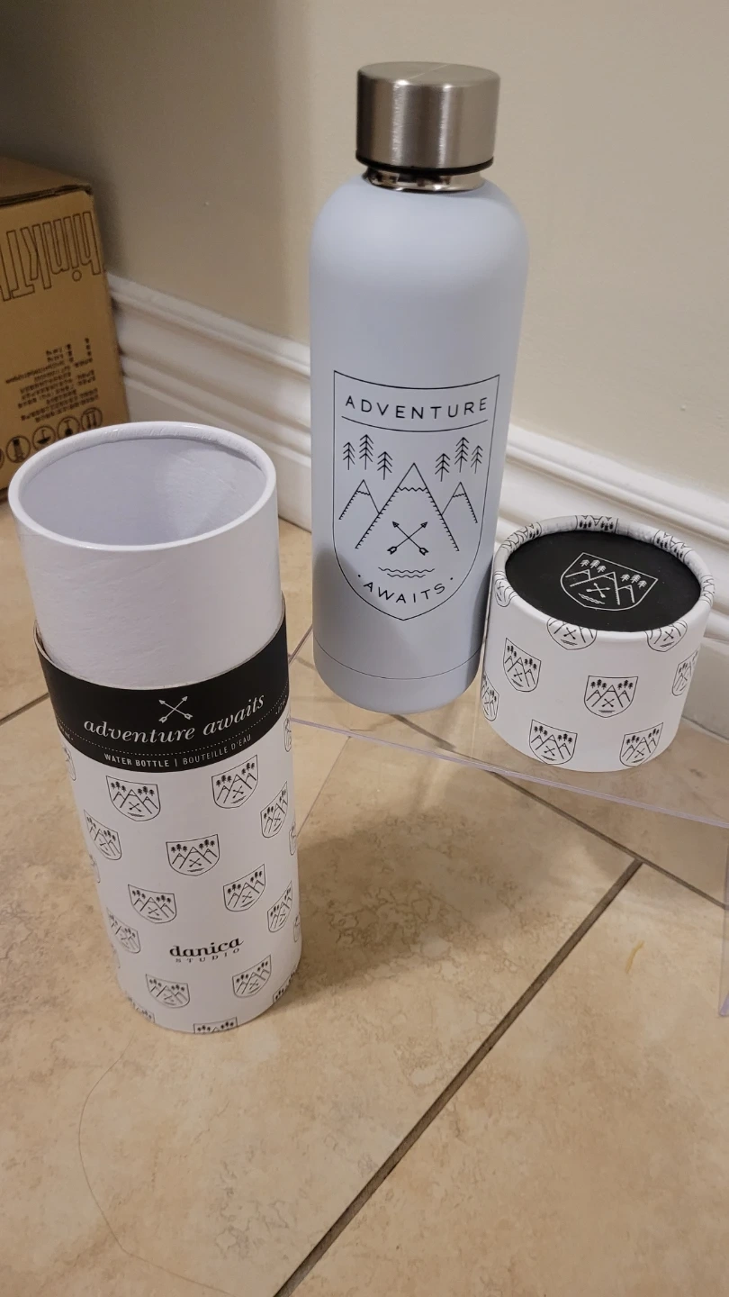 This Danica Studio water bottle features the 'Adventure Awaits' design. It's a reusable water bottle perfect for staying hydrated on the go. Comes in its original packaging tube.