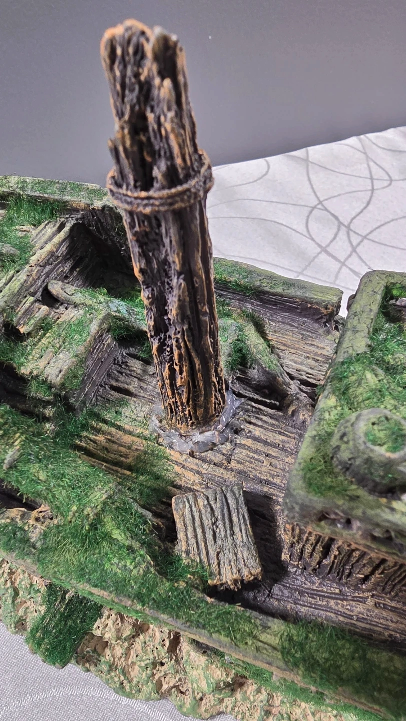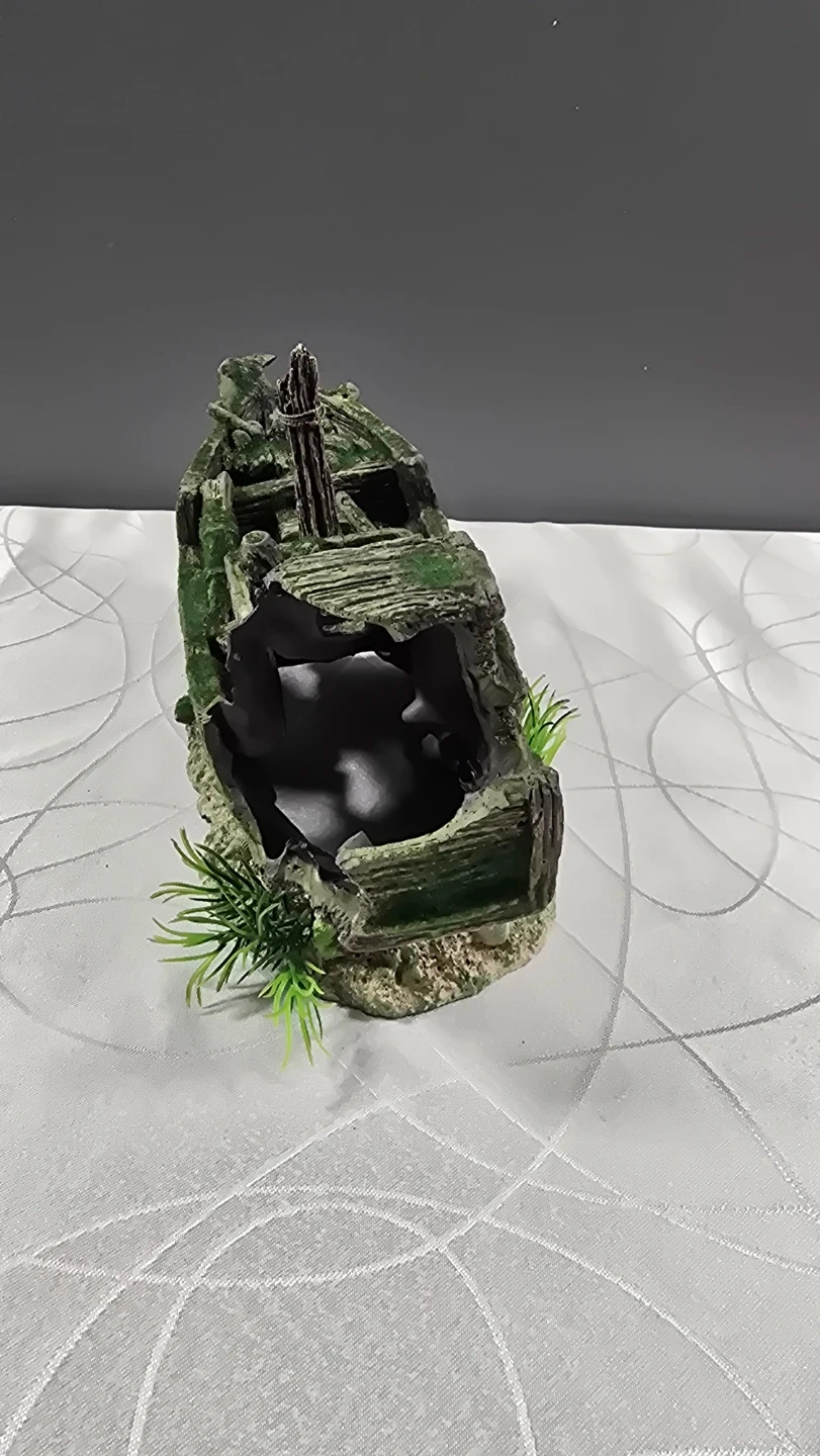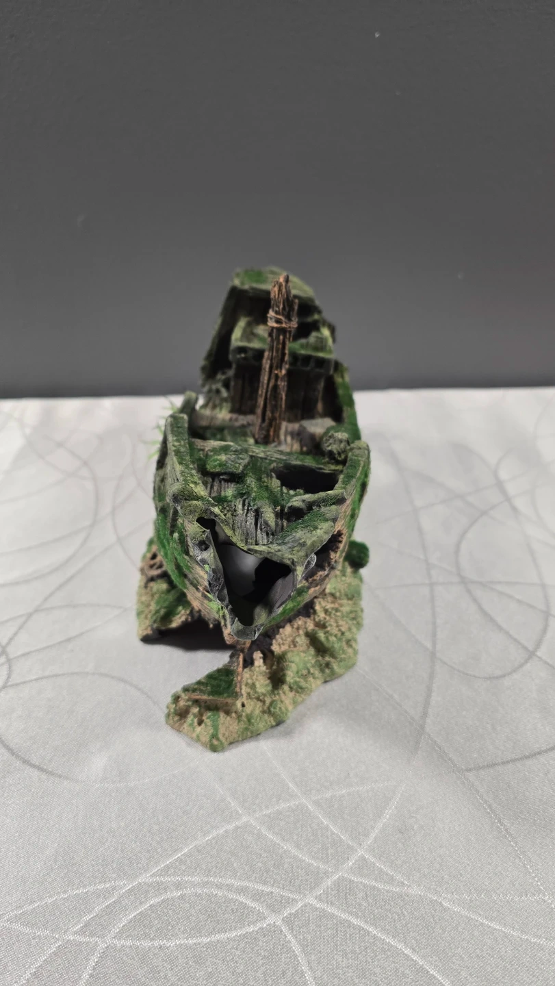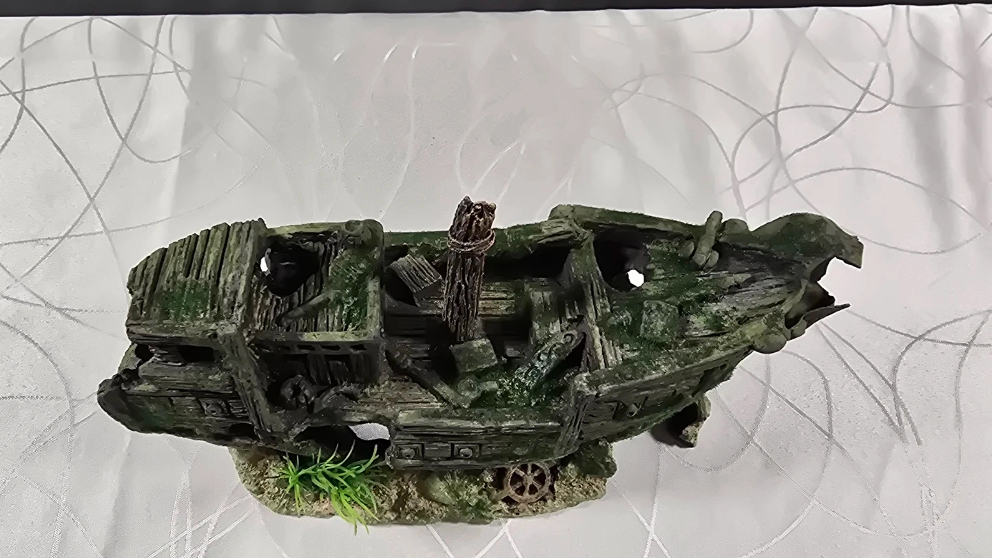 Add some character to your fish tank with this detailed shipwreck ornament. It’s in great condition and features realistic wood textures, moss accents, and a built-in "sandy" base with a tiny ship's wheel.